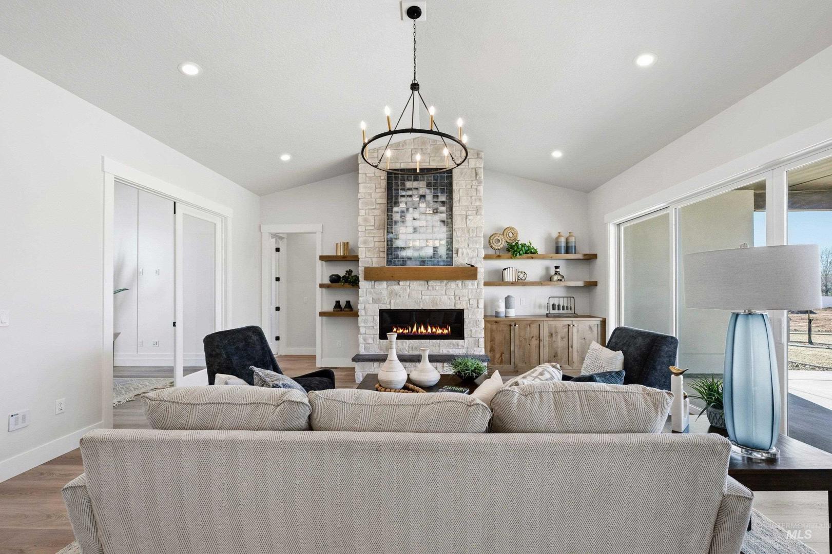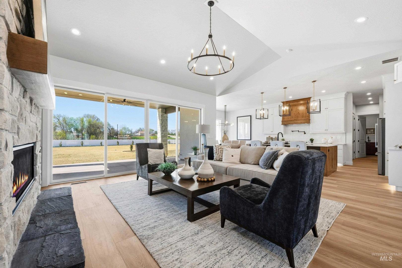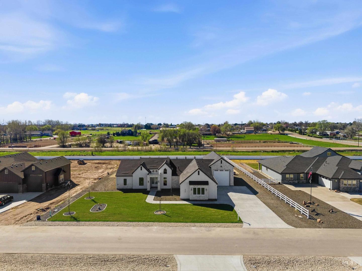Come Enjoy the Idaho Experience Living in the sought-after Spring Hill Ranch Community! This stunning new construction home sits on a full acre with incredible views, blending luxury with everyday functionality. Featuring 3 bedrooms, 3.5 baths, office and an 8-car insulated, painted garage with a 54’ RV bay, there’s plenty of room for all your vehicles and storage. Inside, you’ll find quartz countertops, matte black fixtures, and LVT flooring, all highlighted by soaring 10’+ ceilings. The gourmet kitchen boasts stainless steel appliances, a gas range, double ovens, and a butler’s pantry. The open-concept great room showcases a vaulted ceiling and stone fireplace, with direct access to a covered patio for indoor-outdoor living. Great for entertaining! The primary suite offers coffered ceilings, a walk-in tiled shower, soaking tub, dual vanities and dual walk-in closets. Located minutes to Exit 25, Purple Sage Golf Course, and down downtown Middleton!