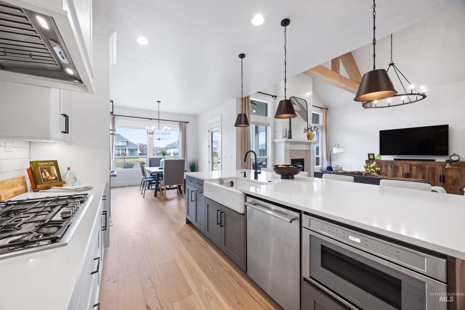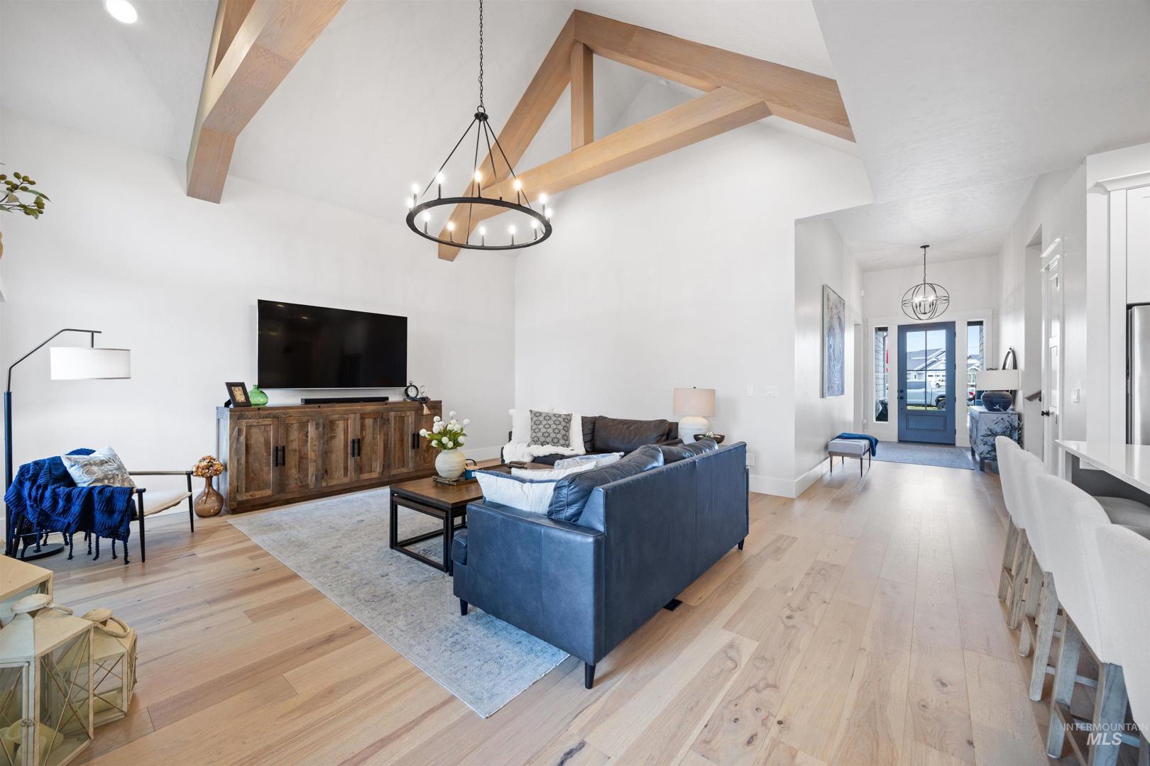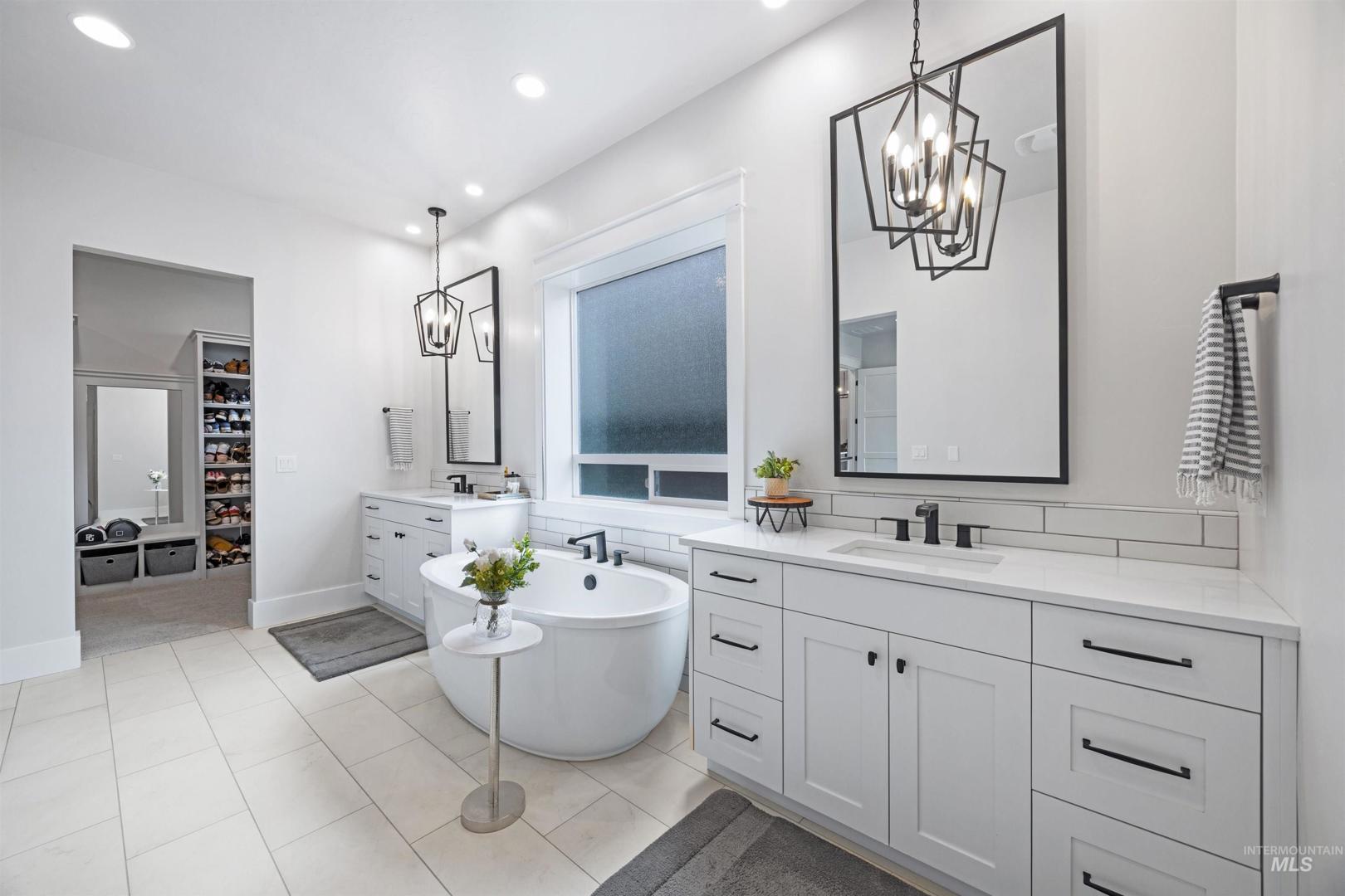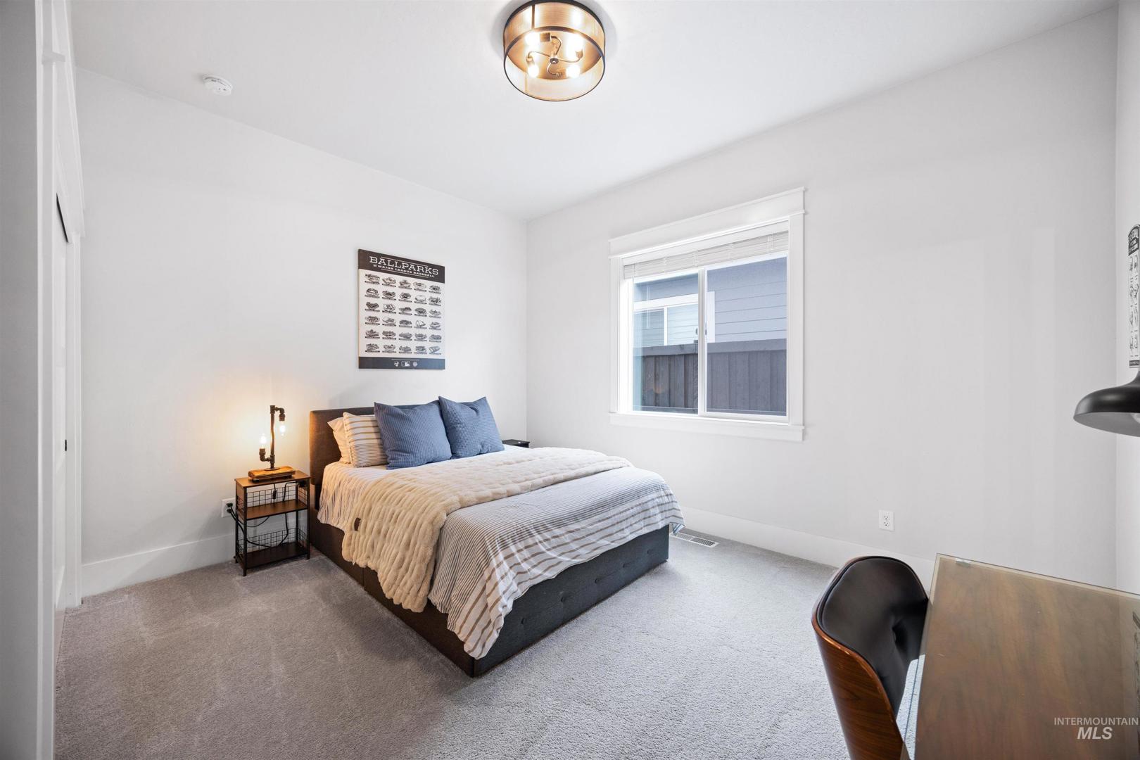 A James Clyde home from the original owners in the coveted Quartet community in Meridian. This home features a deluxe kitchen with all Thermador appliances, quartz counters, and dual ovens. Upstairs, enjoy a bonus room with 9ft ceilings, a full bathroom, and a second thermostat. Vaulted living room ceilings create an open atmosphere while insulated interior walls throughout the home promote a quiet and relaxing feel. Enjoy enhanced privacy on your covered patio with no immediate rear neighbors. BTVAI.