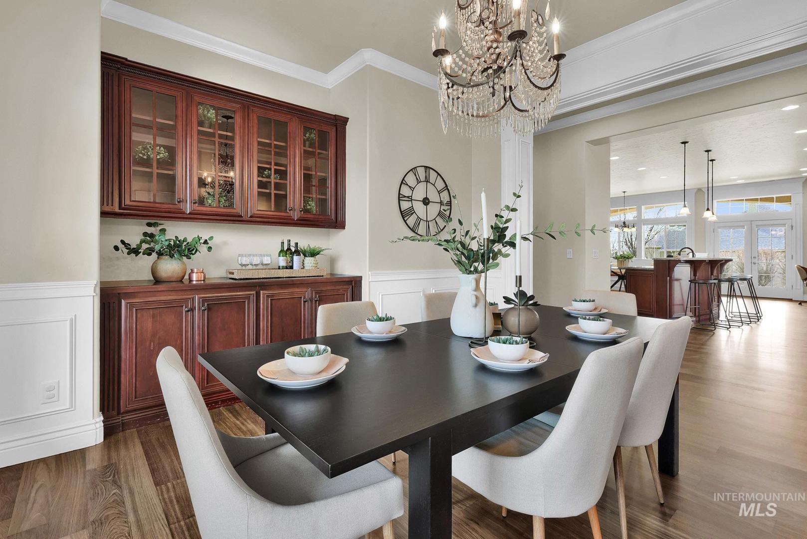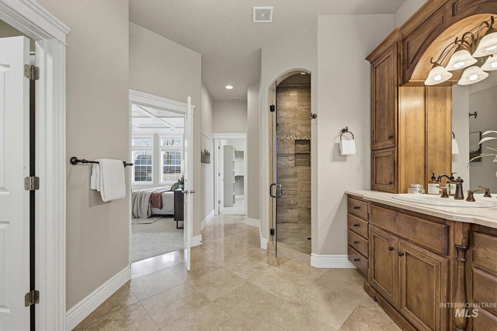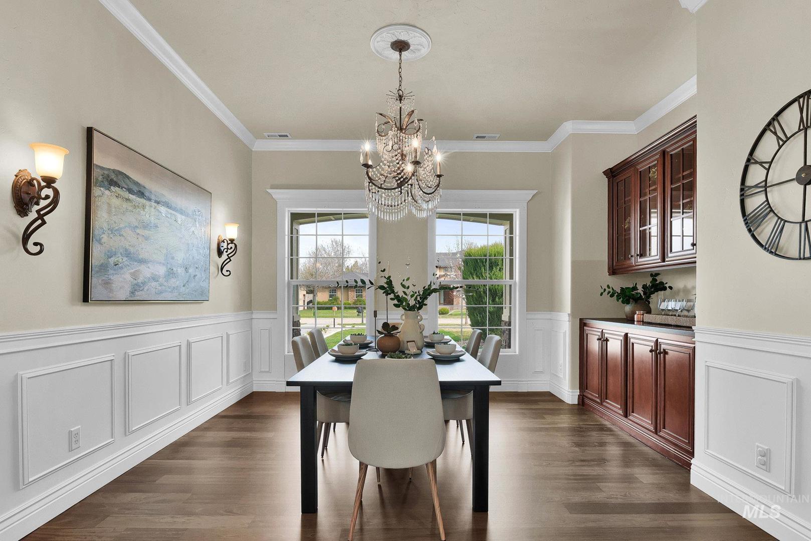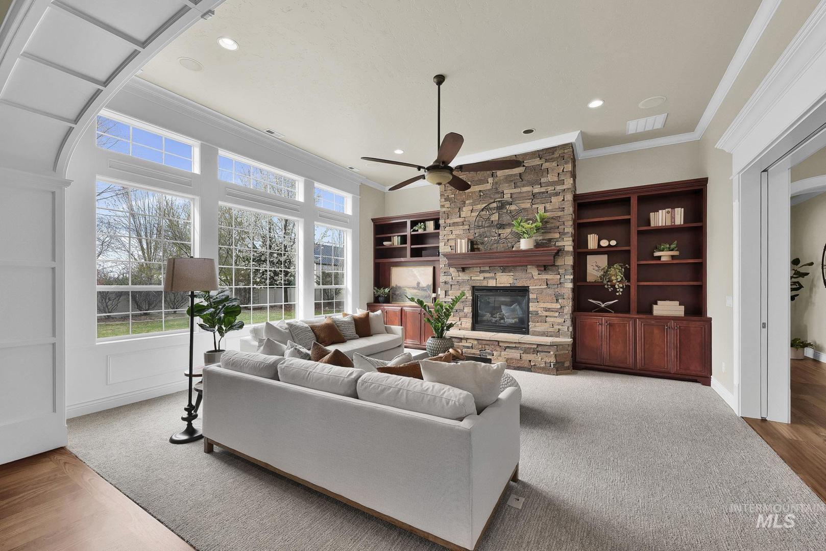 Welcome home to Covenant Hill - where space, craftsmanship, and lifestyle meet on nearly an acre in one of Eagle’s most sought-after neighborhoods. This custom 3-level home is designed for those who value both comfort and capability. The main-level primary suite offers a private retreat with dual vanities, dual walk-in closets, a walk-in shower, and a jetted tub. Thoughtfully designed for everyday living and entertaining, the gourmet kitchen features granite countertops, a large center island, built-in refrigerator, double ovens, Wolf appliances, dual dishwashers, and an oversized pantry. Throughout the home, you’ll find custom millwork, refinished Brazilian Cherry hardwood floors, new carpet, and fresh interior paint. The upper level includes two spacious bedrooms, each with en-suite bathrooms and walk-in closets, plus a versatile flex space. The main level features a formal dining room, casual eating nook, built-in workspace, an inviting living room with a floor-to-ceiling stone fireplace, an additional bedroom with attached bath, and a generously sized mudroom and utility space. Downstairs, the lower level expands your options with a large recreation area, kitchenette, full bathroom, dedicated gym space, theater room, craft room, and a fifth bedroom currently used as an office-plus abundant storage. And for all the extras: a 1,500+ sq ft garage with epoxy floors and an RV bay!