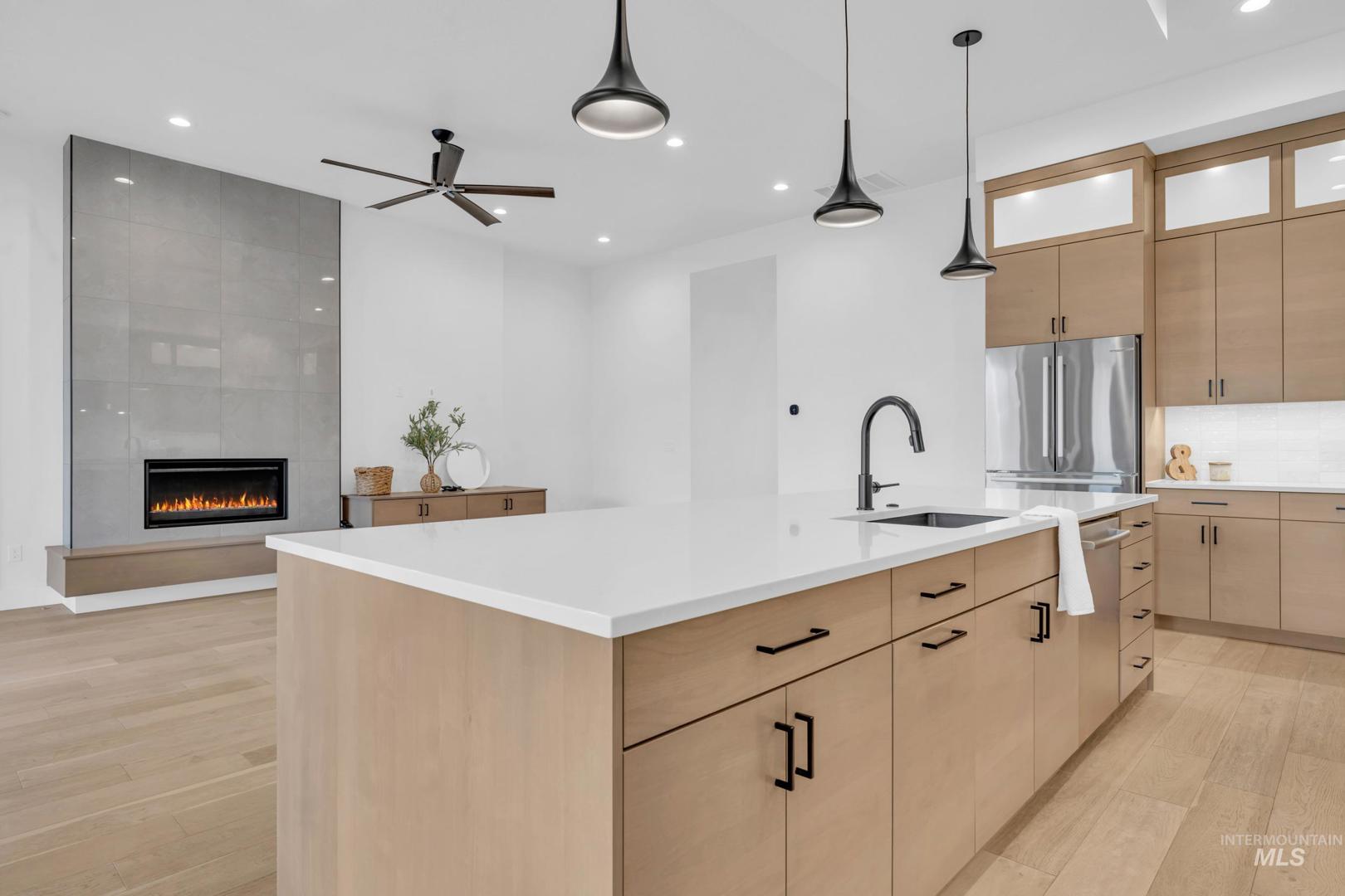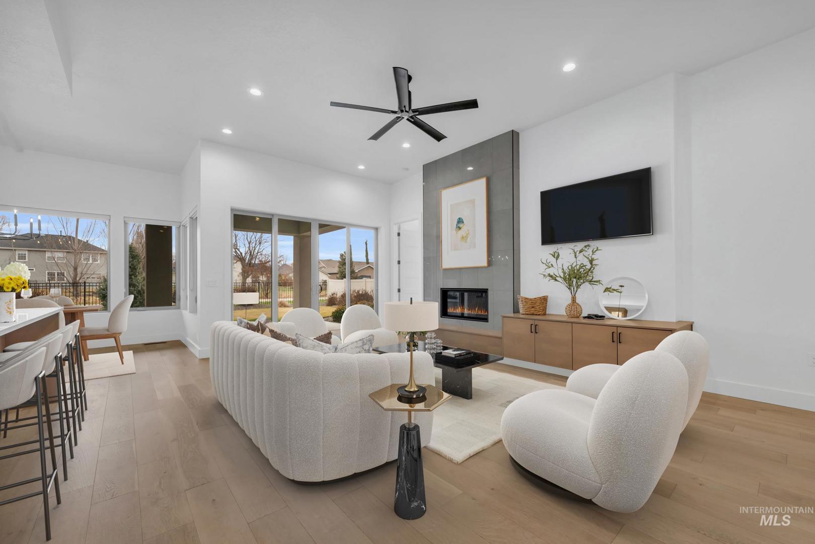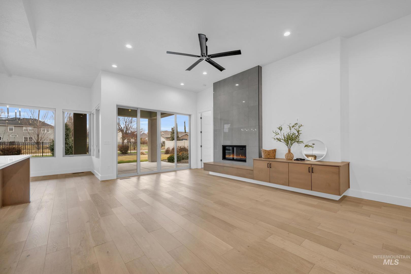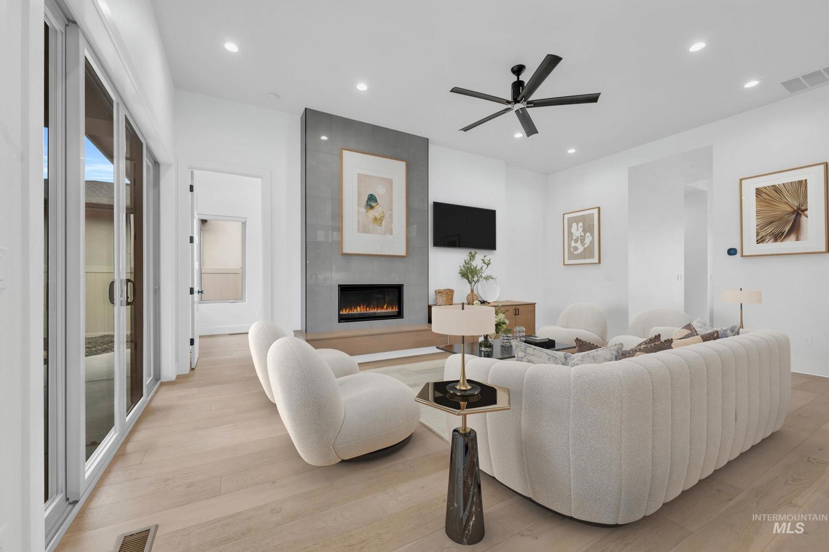 This breathtaking single-level residence is nestled in the highly desirable Movado Estates & is truly pristine. This spacious split-bedroom floor plan is better than new, showcasing the remarkable craftsmanship of ZEC Construction. This home offers an array of impressive features, including 9-10 ft. ceilings & engineered hardwood floors throughout main living areas, kitchen, dining room, hallways & bedroom. The gourmet kitchen is a chef`s dream, featuring custom cabinets w/soft-close features, Bosch S/S appliances, gas cooktop, refrigerator, quartz counters, under-cabinet accent lighting, & a large walk-in butler`s pantry complete with an appliance counter & extra outlets. The inviting family room is a standout with gas fireplace, built-in TV console, & double sliding doors that lead to a spacious private patio overlooking a serene canal, providing additional privacy & space from neighbors, this backyard will be perfect for those quiet nights & includes a hot tub pre-wire. Luxurious master suite is designed for comfort, boasting a spacious bathroom with double vanities, custom tile, quartz counters, a free-standing soaker tub, large custom tile walk-in shower, separate toilet area & a large closet. The home offers ample storage options, including a large mudroom & a bright laundry room. Every room is fitted with custom blackout shades, the guest rooms features walk in closets.