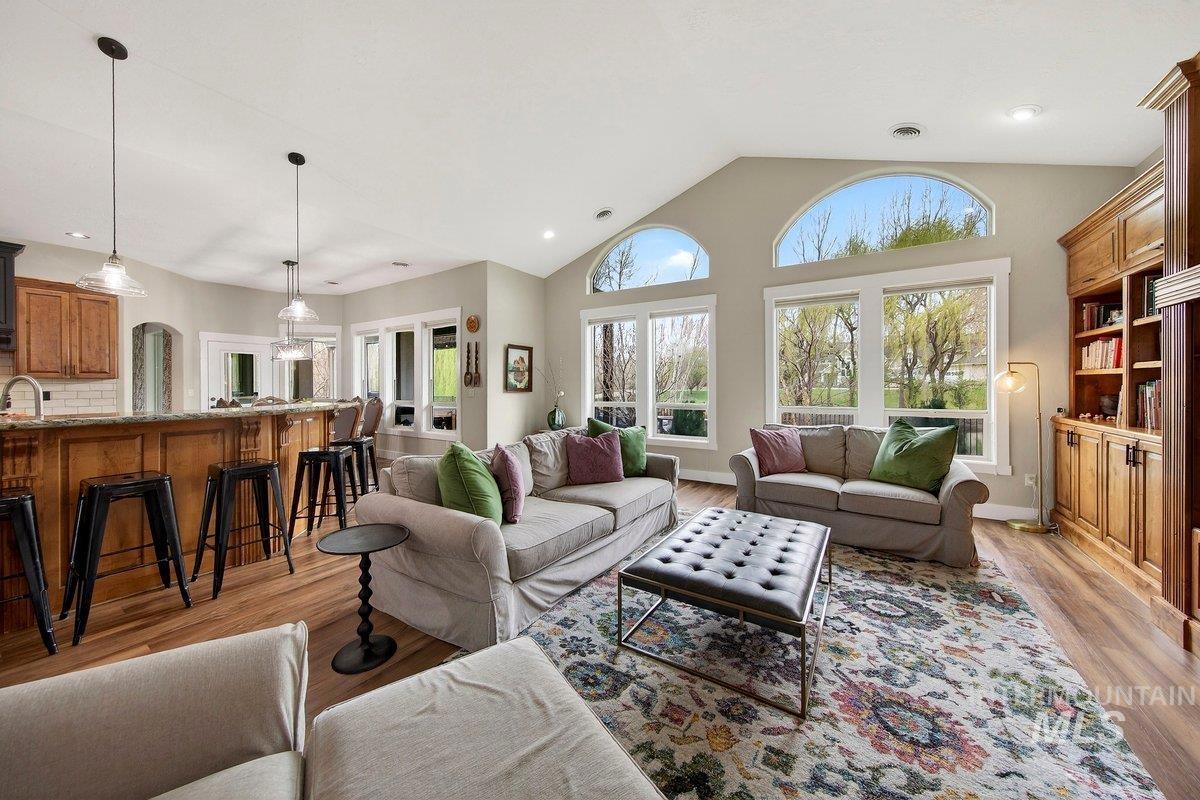 Waterfront Living in Rivers End! Perfectly private with no immediate rear neighbors, this rare lot offers tranquility in the heart of Eagle—just minutes from downtown, the Boise River, dining, and shopping. Recently remodeled with exceptional attention to detail, this home shines inside and out. The outdoor living spaces are as impressive as the interior, featuring a beautifully updated covered patio, firepit, garden boxes, in-ground trampoline, and full fencing—perfect for relaxing or entertaining. Inside, enjoy stunning water views from the kitchen, family room, and primary suite, along with a private balcony off the upstairs bonus room. The spacious rec room is a true highlight, complete with a theater area, built-in beverage station, and plenty of room for games or ping pong. The gourmet kitchen features granite countertops and flows seamlessly into the main living areas. Additional highlights include large bedrooms with walk-in closets, multiple living spaces, separate dining and craft rooms, and two inviting fireplaces. Recent upgrades include new flooring, fresh interior paint, updated HVAC, roof improvements, and a fully enhanced rec room. Enjoy access to the community pool, direct access to the Boise River and Greenbelt, and a quick bike ride to all that Eagle has to offer. 5 Bedrooms 3.5 bath, formal dining room and den. There is a living room and a family room.