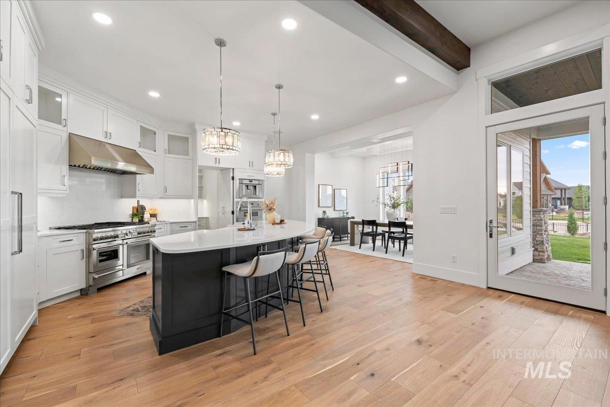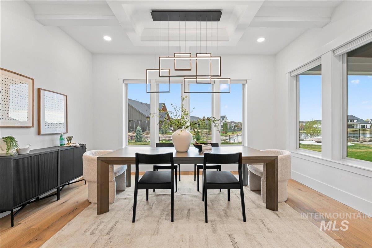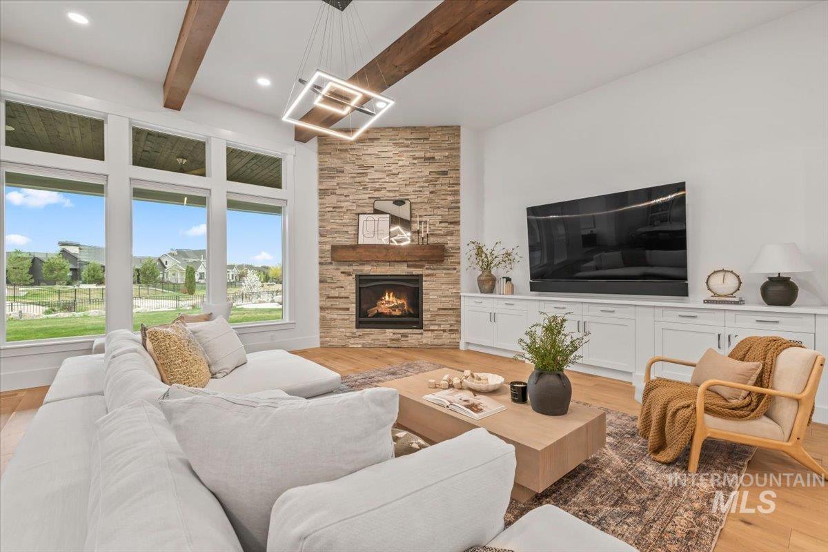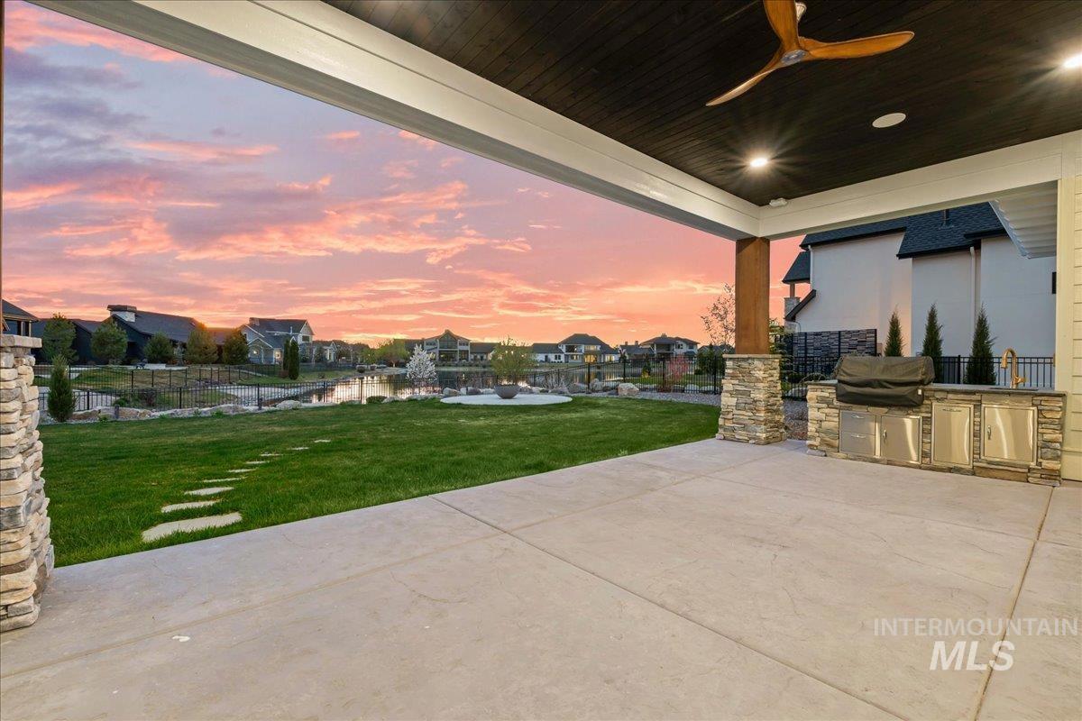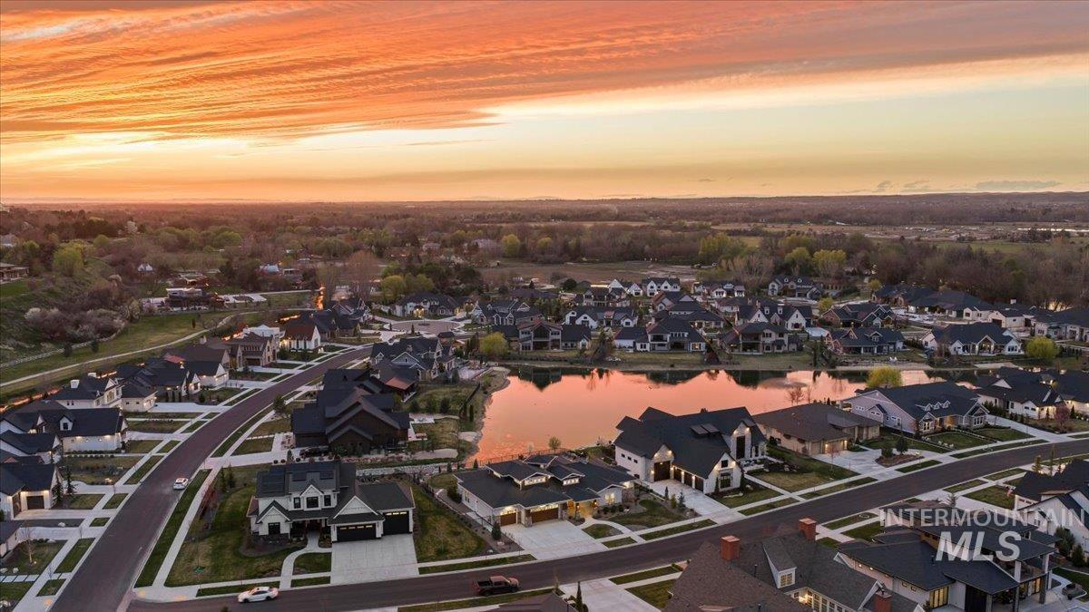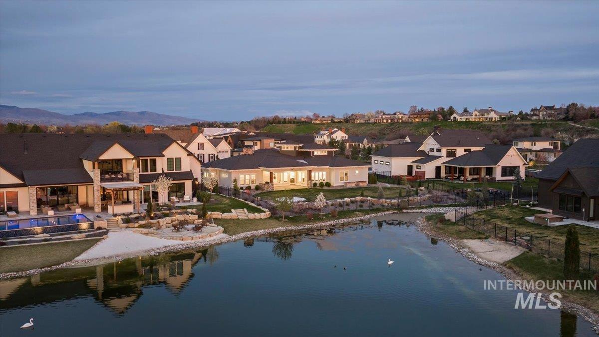 Premier waterfront living in the highly sought-after Creighton Woods. Ideally located in the heart of the Eagle Island corridor, this custom-built residence blends timeless design, refined finishes, and peaceful pond views. Rich hardwood floors carry through the open-concept main living area, where expansive windows fill the home with natural light and frame the serene setting. The chef’s kitchen is outfitted with high-end Thermador appliances, including a professional 48-inch range, built-in speed oven, coffee maker, and quartz countertops. The thoughtfully designed layout features a luxurious primary suite with built-in shelving and a cozy reading nook overlooking the water, complemented by a spa-inspired bath with oversized tile, dual vanities, and a meticulously designed walk-in closet. Two additional ensuite bedrooms, an office, and a flexible laundry/craft room complete the main level. Upstairs offers an oversized bonus room and dedicated gym space, creating the ideal retreat for relaxation or recreation. Outdoor living shines with a built-in BBQ, firepit area, and an inviting waterfront setting designed for effortless entertaining. Multiple access points to Eagle Rd & Chinden - great for dining and shopping!