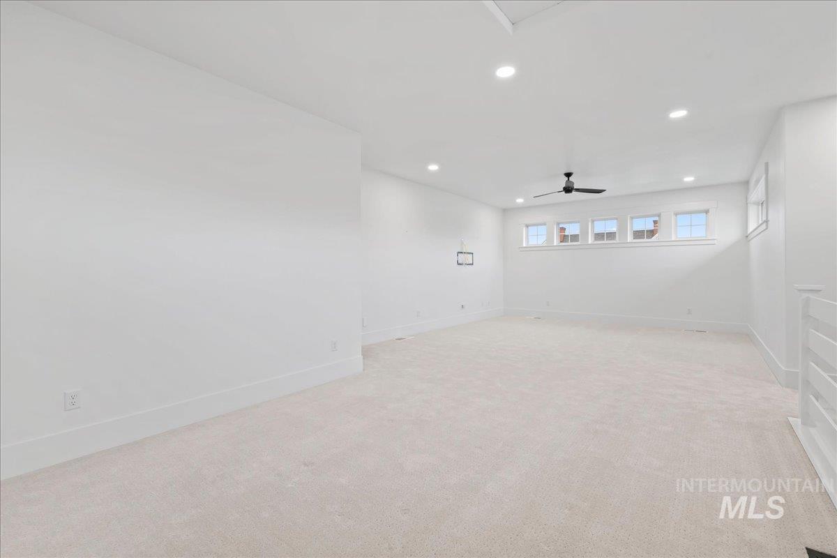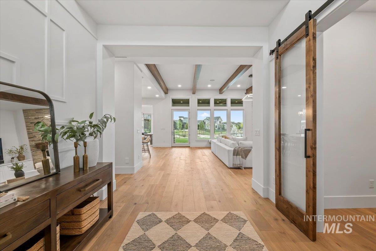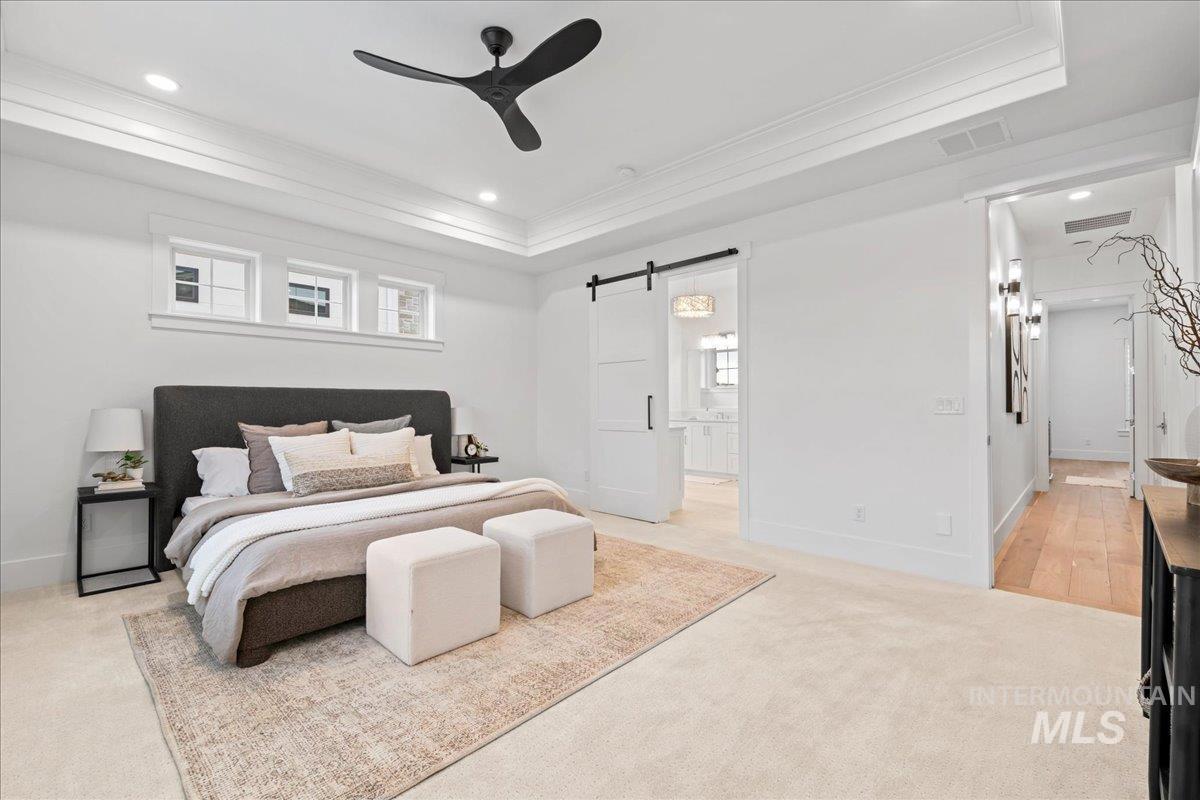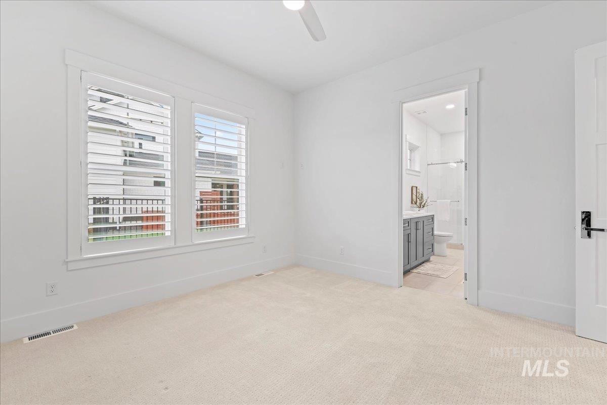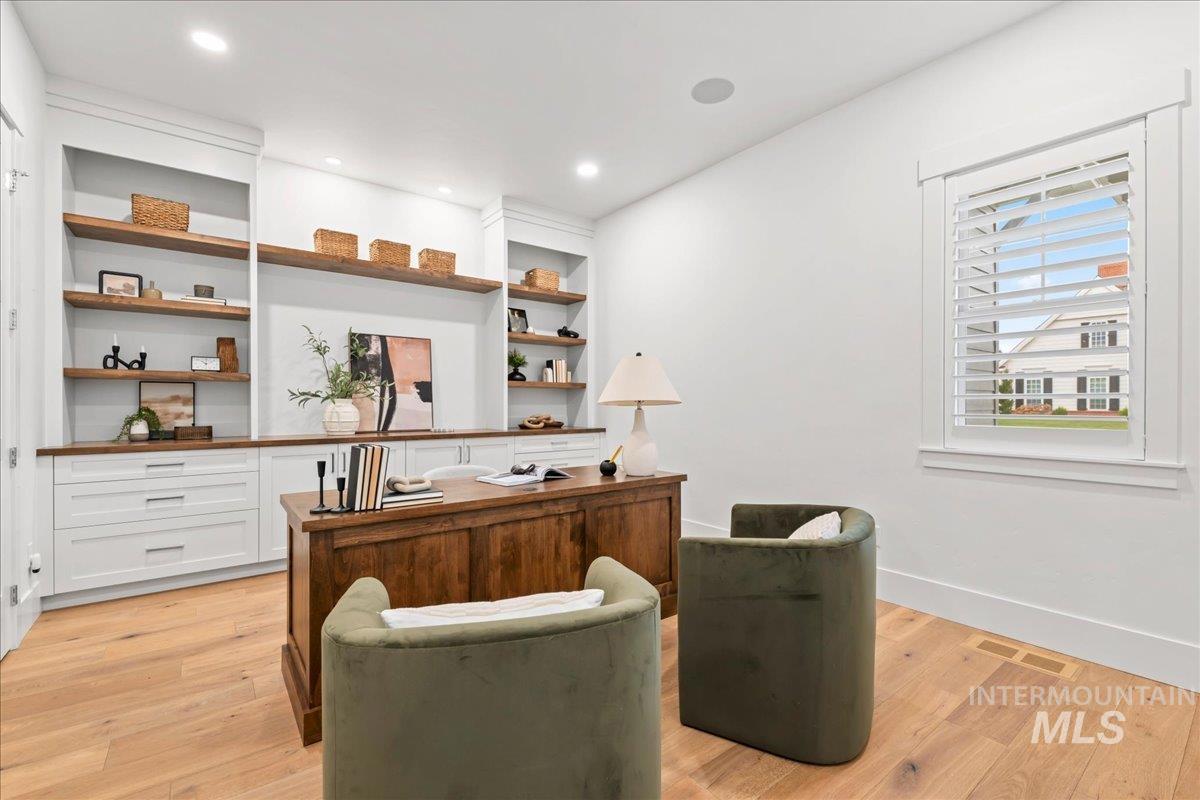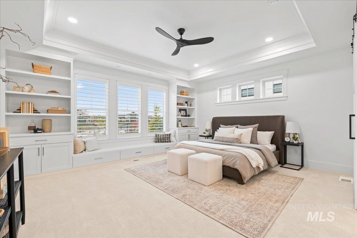 Premier waterfront living in the highly sought-after Creighton Woods. Ideally located in the heart of the Eagle Island corridor, this custom-built residence blends timeless design, refined finishes, and peaceful pond views. Rich hardwood floors carry through the open-concept main living area, where expansive windows fill the home with natural light and frame the serene setting. The chef’s kitchen is outfitted with high-end Thermador appliances, including a professional 48-inch range, built-in speed oven, coffee maker, and quartz countertops. The thoughtfully designed layout features a luxurious primary suite with built-in shelving and a cozy reading nook overlooking the water, complemented by a spa-inspired bath with oversized tile, dual vanities, and a meticulously designed walk-in closet. Two additional ensuite bedrooms, an office, and a flexible laundry/craft room complete the main level. Upstairs offers an oversized bonus room and dedicated gym space, creating the ideal retreat for relaxation or recreation. Outdoor living shines with a built-in BBQ, firepit area, and an inviting waterfront setting designed for effortless entertaining. Multiple access points to Eagle Rd & Chinden - great for dining and shopping!