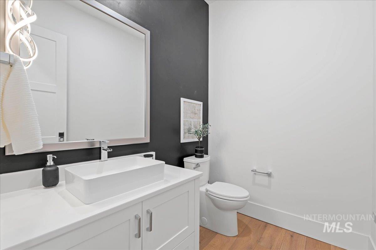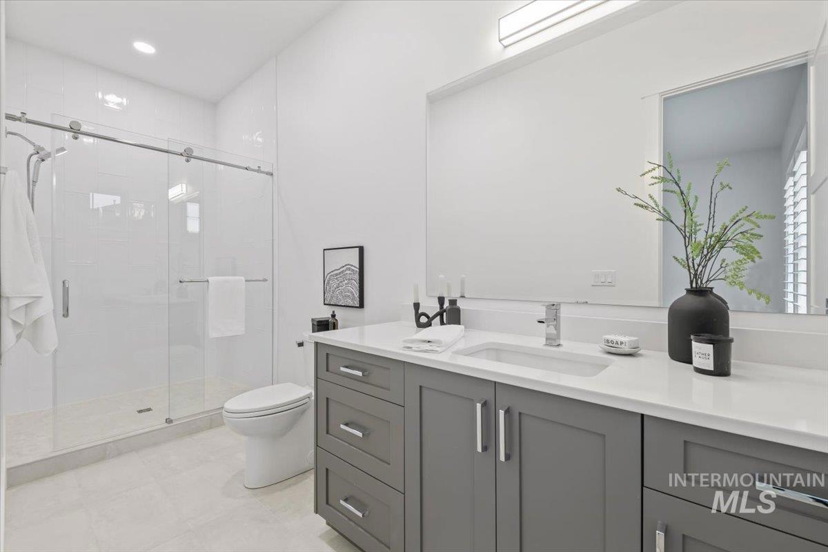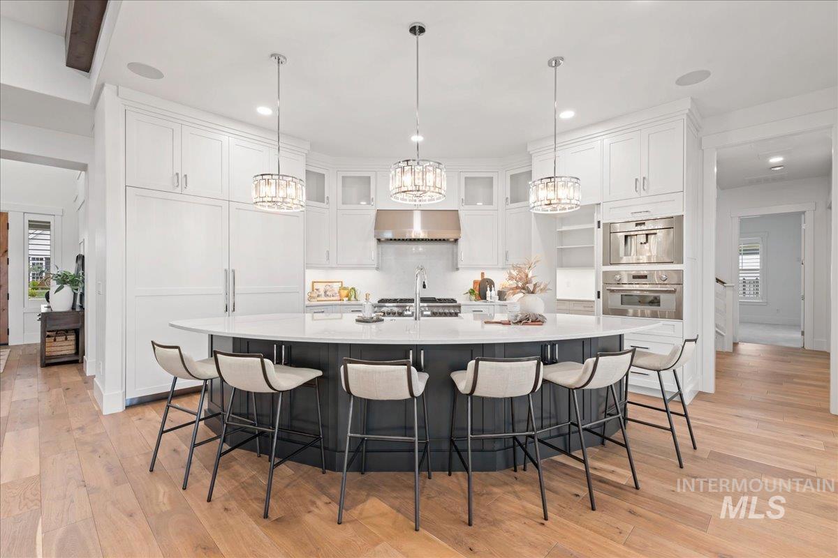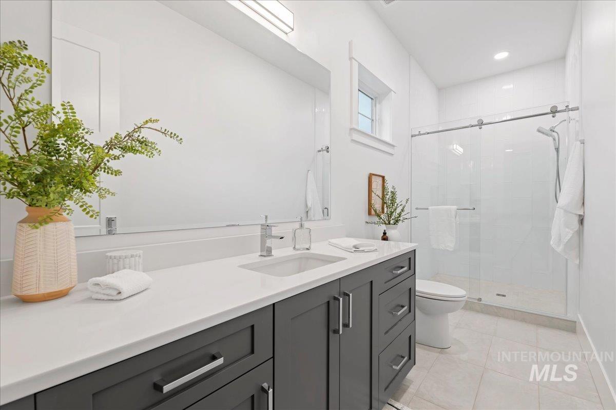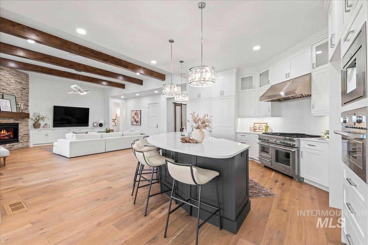 Premier waterfront living in the highly sought-after Creighton Woods. Ideally located in the heart of the Eagle Island corridor, this custom-built residence blends timeless design, refined finishes, and peaceful pond views. Rich hardwood floors carry through the open-concept main living area, where expansive windows fill the home with natural light and frame the serene setting. The chef’s kitchen is outfitted with high-end Thermador appliances, including a professional 48-inch range, built-in speed oven, coffee maker, and quartz countertops. The thoughtfully designed layout features a luxurious primary suite with built-in shelving and a cozy reading nook overlooking the water, complemented by a spa-inspired bath with oversized tile, dual vanities, and a meticulously designed walk-in closet. Two additional ensuite bedrooms, an office, and a flexible laundry/craft room complete the main level. Upstairs offers an oversized bonus room and dedicated gym space, creating the ideal retreat for relaxation or recreation. Outdoor living shines with a built-in BBQ, firepit area, and an inviting waterfront setting designed for effortless entertaining. Multiple access points to Eagle Rd & Chinden - great for dining and shopping!