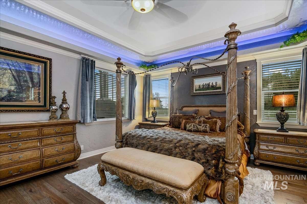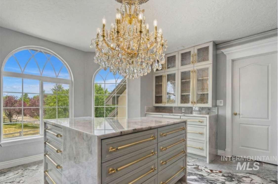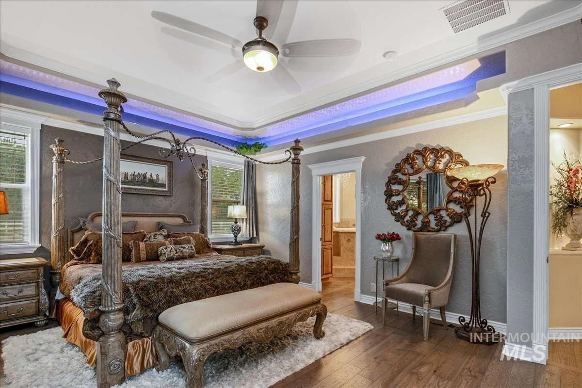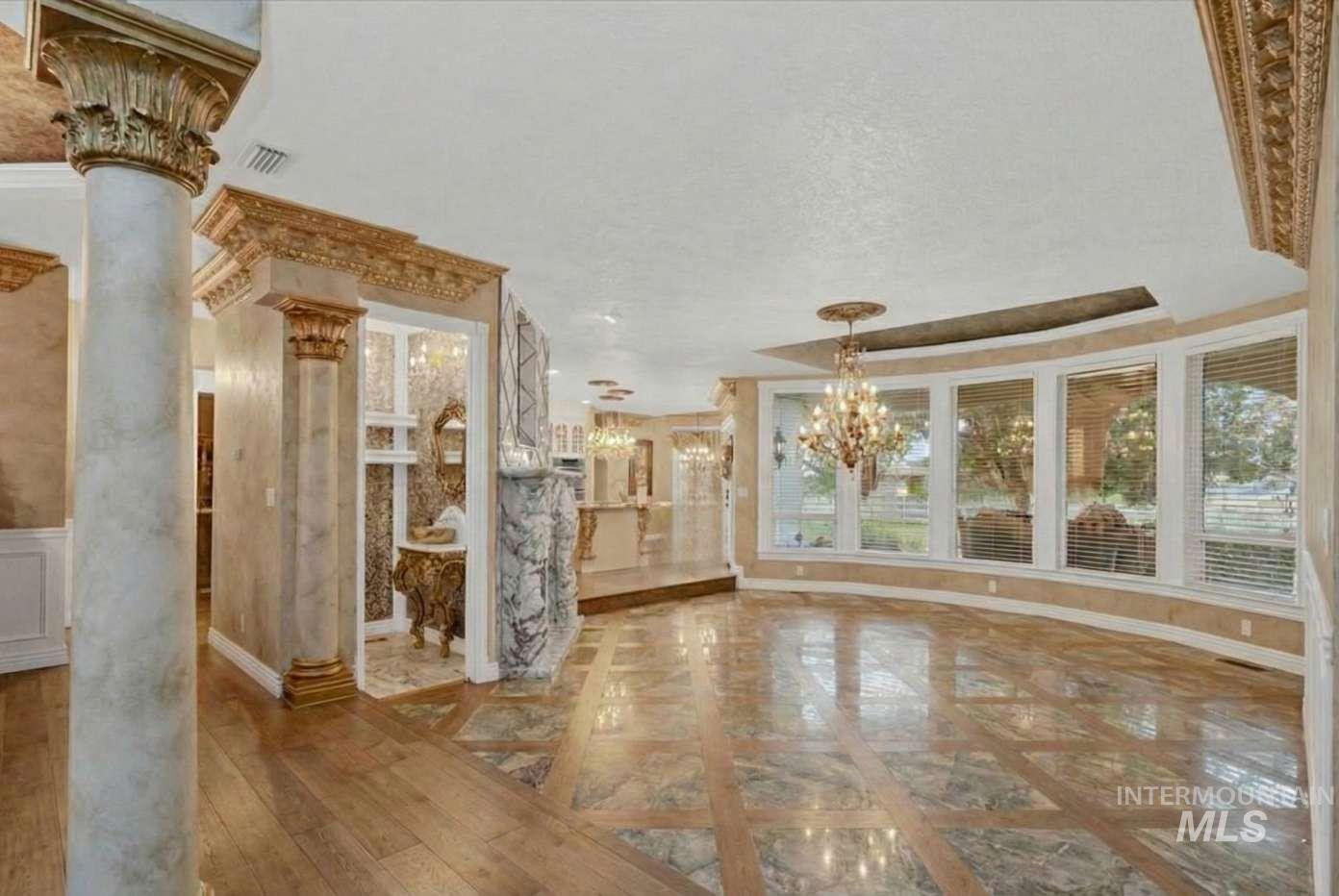 Nothing in the Treasure Valley compares. Wind down a cherry blossom-lined private drive to this award-winning-designed luxury compound. The 6,200 sf residence features a sunken lattice-weave marble living room, 2,000 lb European marble fireplace, crystal chandeliers throughout, and zero carpet, wide-plank hardwood in every room. Two primary wing suites each offer a fireplace, 2-person jet tub & dedicated closet. Building 2: theater room, 9-car climate-controlled garage, private gym, infrared & steam sauna, grand loft & library. Building 3: 48x48 insulated warehouse, dual 50-amp RV bays, 2-stall horse barn & finished office with fireplace and chandelier. Outside: stamped concrete terrace, outdoor jacuzzi, wood-burning gazebo & 3 acres of private pasture. Vacant and move-in ready.
