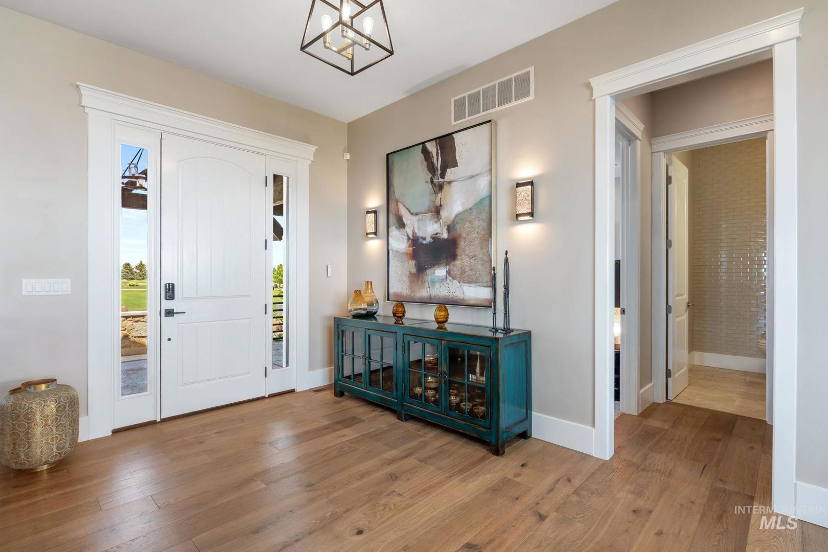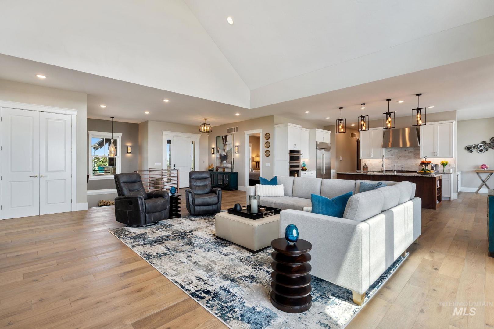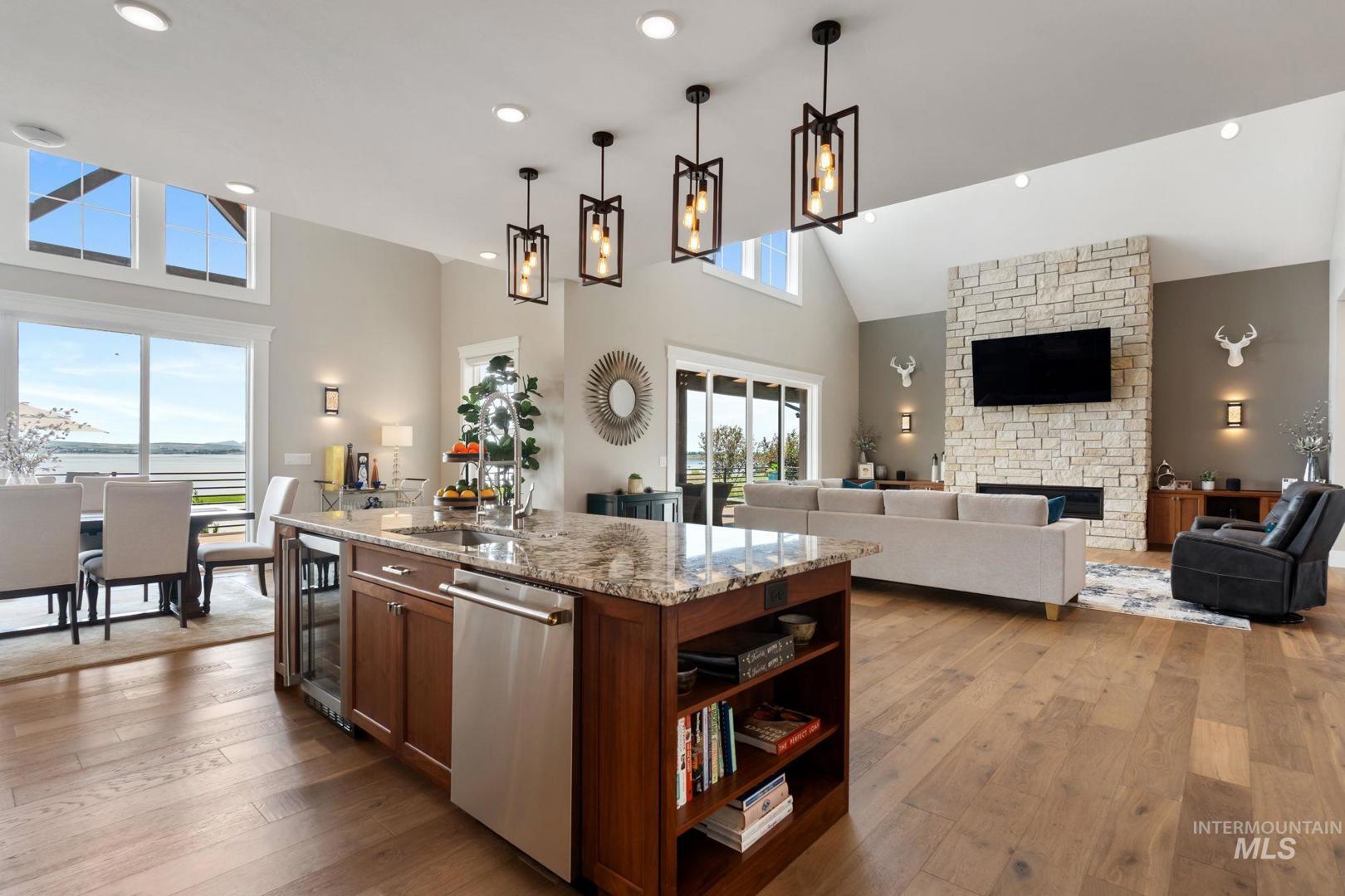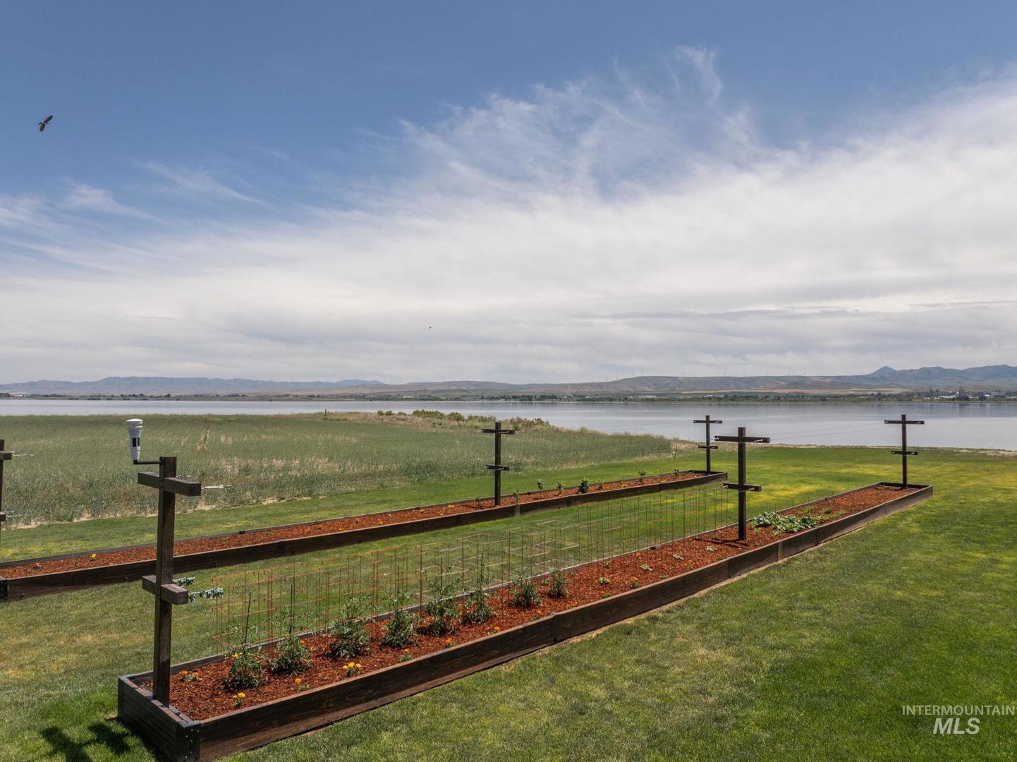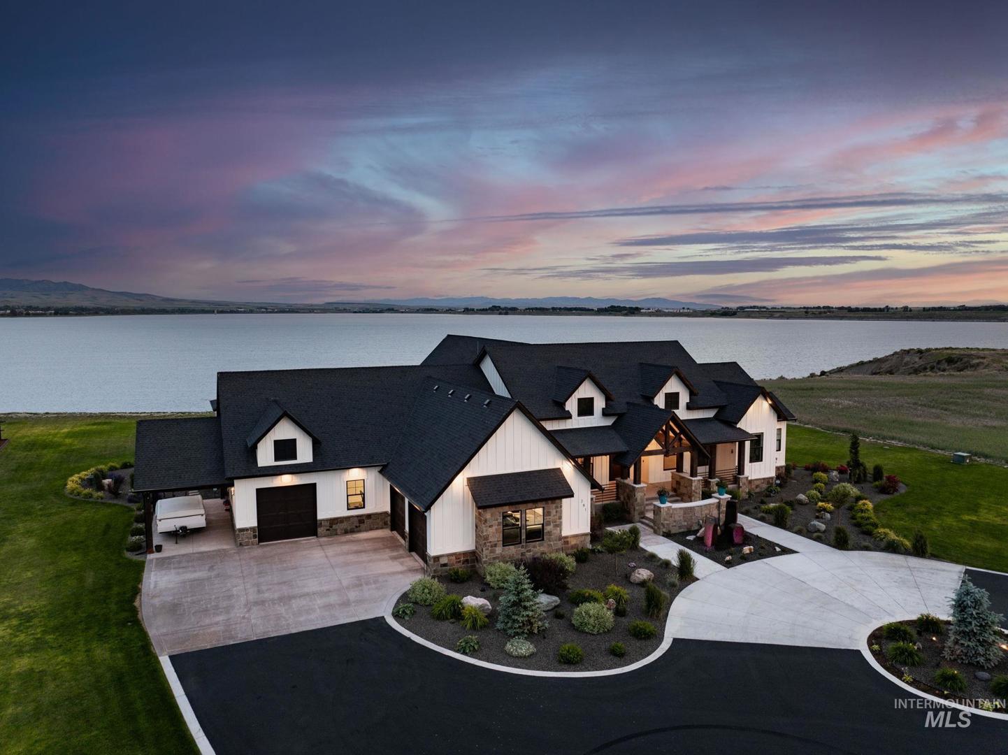 Lakeside luxury meets self sustaining lifestyle! Enjoy luxury independence with this custom waterfront estate in Waters Edge: American Falls exclusive gated community. Designed to impress, this home showcases expansive living spaces: dramatic 22` vaulted ceilings, two 14` stone fireplaces, & 10` ceilings throughout with windows & glass sliders that frame truly breathtaking, panoramic water & mountain views. Expansive living spaces flow effortlessly, offering the perfect balance of openness and comfort. Three main-level ensuites provide ample privacy for rest and relaxation as designer finishes elevate each room. Premium Monogram appliances & dual Lennox HVAC systems exude high efficiency year-round performance. The spacious lower level is an entertainer`s dream, featuring a wet bar, a home gym, crafting room & abundant storage. Two sizable bedrooms and bathroom offer everyday functionality without compromise. Outdoors, indulge in a private resort-style & homestead-to-table setting. An expansive 2800 sqft wraparound deck leads to a stunning saltwater pool, complete with a Bullfrog spa, set against unobstructed lake views. Meticulously manicured grounds showcase flower beds, tranquil water features, a mature orchard, & raised vegetable gardens. This is more than a home; it`s a statement of refined living offering immediate access to fishing, boating & scenic lakeside hiking.