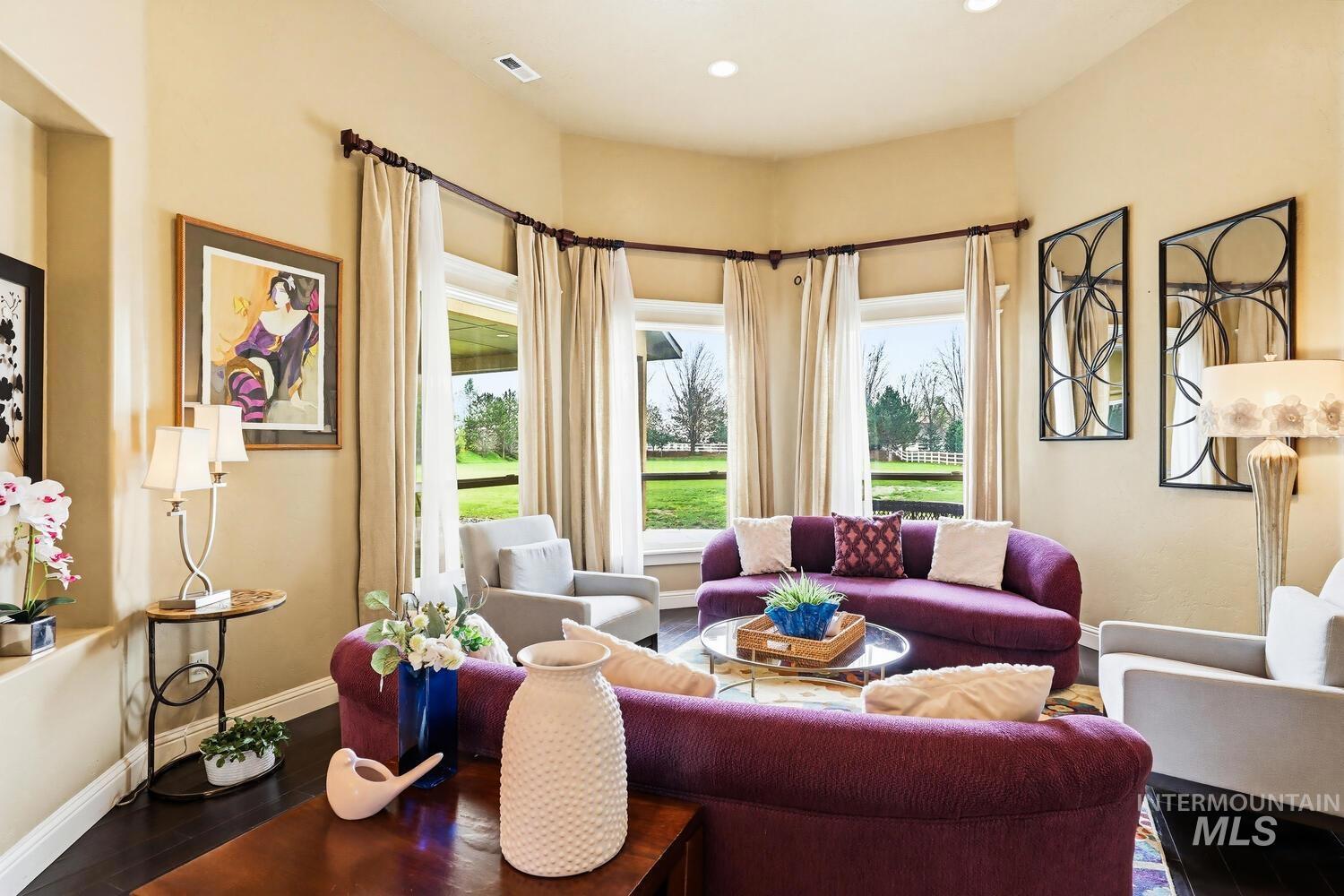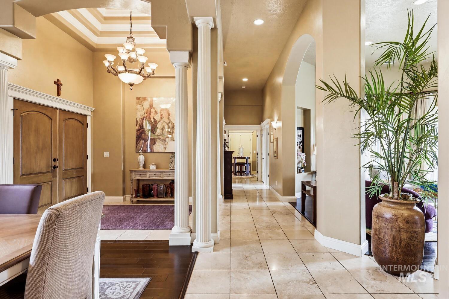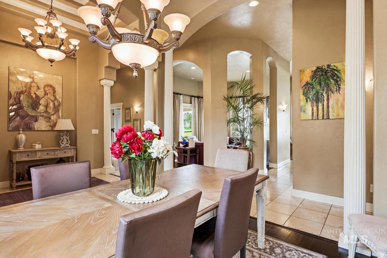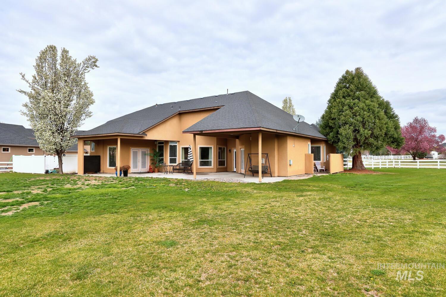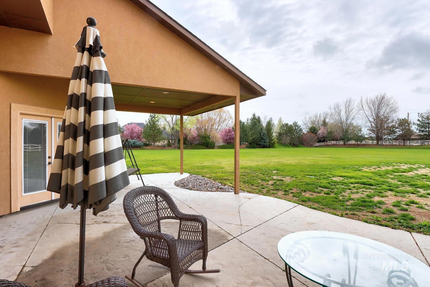 Experience the ultimate blend of luxury and tranquility in a stunning estate nestled on nearly two pristine acres in the heart of Eagle. This rare property offers the perfect balance of expansive outdoor space and refined indoor living, designed specifically for those who value privacy, comfort, and accessibility. One standout feature of this residence is its true single-level design. Spanning almost 3500 square feet the home allows for complete living on one floor, eliminating the hassle of stairs while maintaining an airy, open-concept feel. The thoughtful split-bedroom floor plan ensures a private retreat for the primary suite, which boasts a spa-like bath with a garden tub and elegant travertine tile work. Step inside to find high-end finishes throughout, including soaring ceilings, rich hardwood flooring, and a gourmet chef’s kitchen featuring granite countertops and stainless steel appliances. Outside, the 1.94-acre lot provides a massive canvas for gardening, recreation, or simply enjoying the peaceful views. Whether you’re hosting guests on the covered patio or relaxing in the front courtyard, this home is built for entertaining. Complete with a three-car garage and dedicated RV parking, this estate offers the space you need and the lifestyle you’ve been looking for.