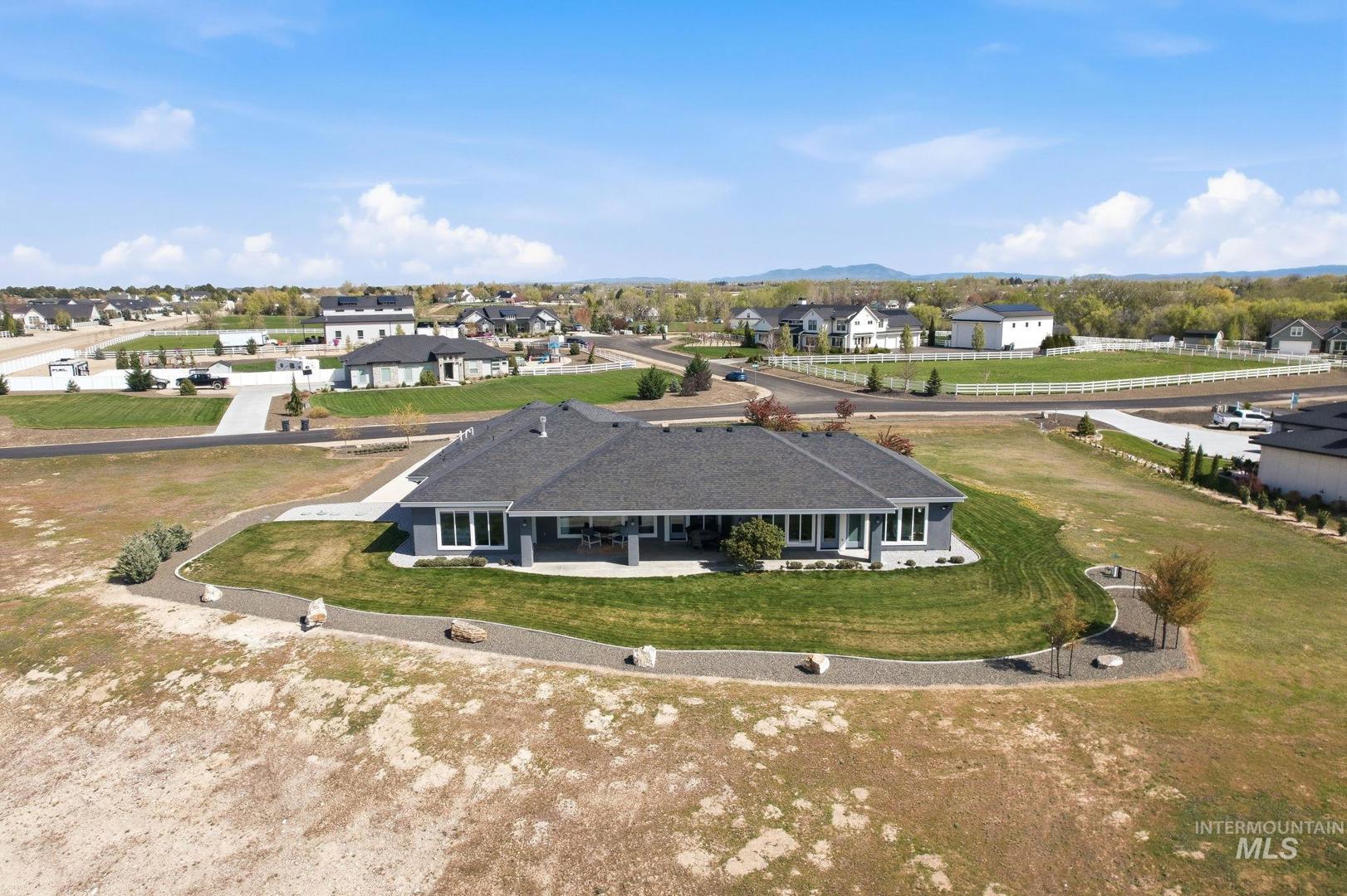 Wake up to wide-open skies and the kind of quiet that`s hard to find. This one-level retreat on nearly 2 acres in Albion Acres puts you outside city limits — no city taxes, no city noise — just 31 neighbors who value space and privacy as much as you do. Bring your dreams! Ample space to build your ideal shop, plant your dream garden, or bring your horse (or horses!) — with plenty of room to roam and create your own private equestrian paradise. There are already 25+ lavender plants established and ready to thrive alongside your future grapevines. Spend mornings with coffee watching the sunrise through a wall of windows that spans the entire back of the home. Every bedroom opens directly to the patio or walkway, so indoor-outdoor living isn`t a feature — it`s a daily habit. Dual masters at opposite ends of the house mean guests or multigenerational family have their own world entirely. The garage handles your trucks, toys, and projects. Pressurized irrigation keeps things green without touching your well. Evenings? Curl up by a fireplace that actually heats the room, not just the mood. The neighborhood paths wind past a pond and creek right on your lot. Close to the freeway when life calls. Far enough away when it doesn`t.