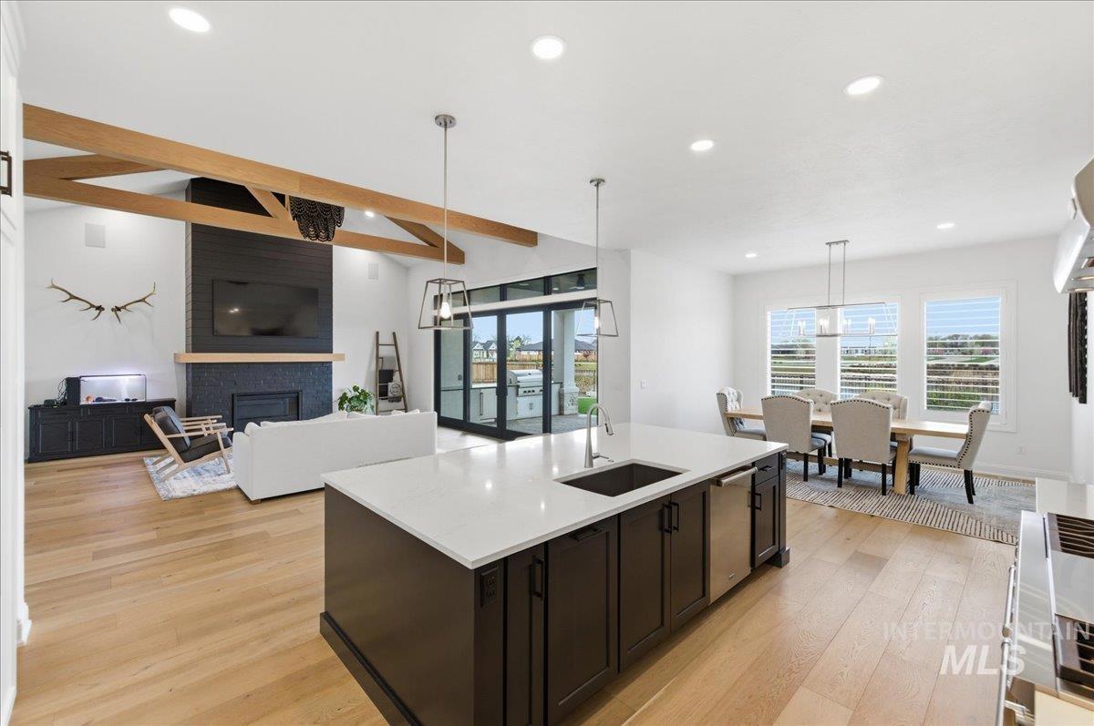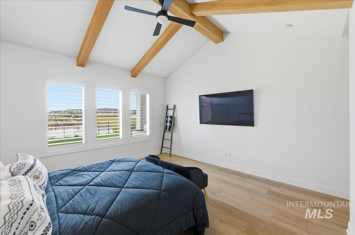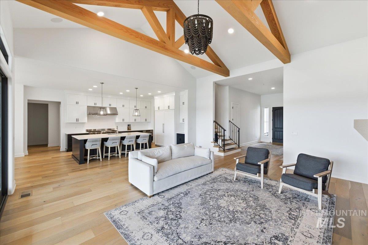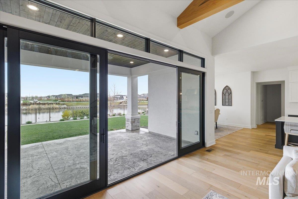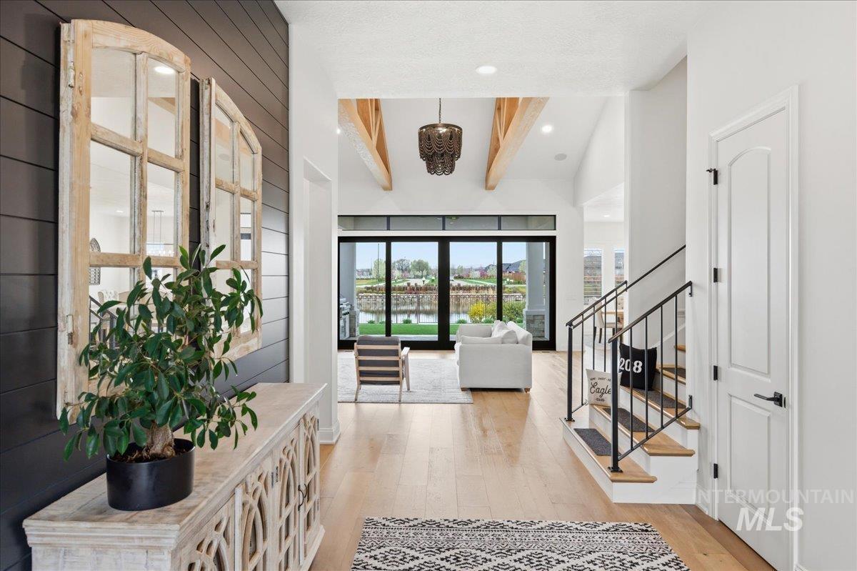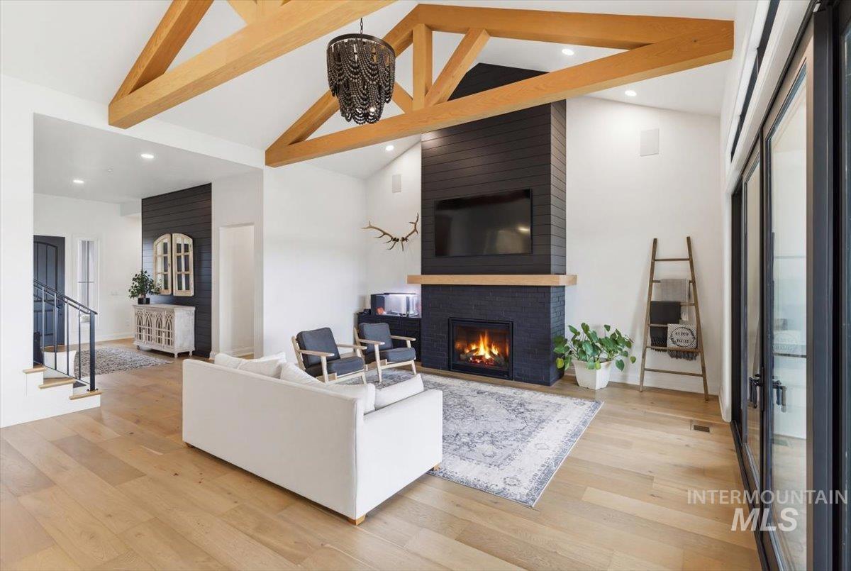 Set in a fantastic waterfront setting, this stunning modern farmhouse by Northern Construction blends timeless design with elevated, everyday living. From the moment you step inside, you’re greeted by soaring ceilings, exposed wood beams, and a striking floor-to-ceiling fireplace that anchors the main living space with warmth and character. The thoughtfully designed floorplan lives like a single level, offering both comfort and functionality with a luxurious primary suite and private guest suite on the main level, plus a dedicated main level office. The primary retreat is a true sanctuary, featuring heated floors, dual vanities, a walk-in glass shower, and a soaking tub designed for relaxation. At the heart of the home, the chef’s kitchen impresses with a premium Wolf range, custom finishes, and seamless flow into the dining and living areas—perfect for entertaining. Extend your living outdoors with an outdoor kitchen overlooking the peaceful waterfront setting. Upstairs, a spacious bonus room with a full bath offers the perfect flex space for guests, a media room, or additional living. Additional highlights include solid core doors, a built-in Sonos sound system, conditioned crawl space, dual furnaces and A/C units for optimal efficiency, and an oversized 1,234 sq ft garage offering ample space for storage, toys, or hobbies. Lightly lived in & in impeccable condition.