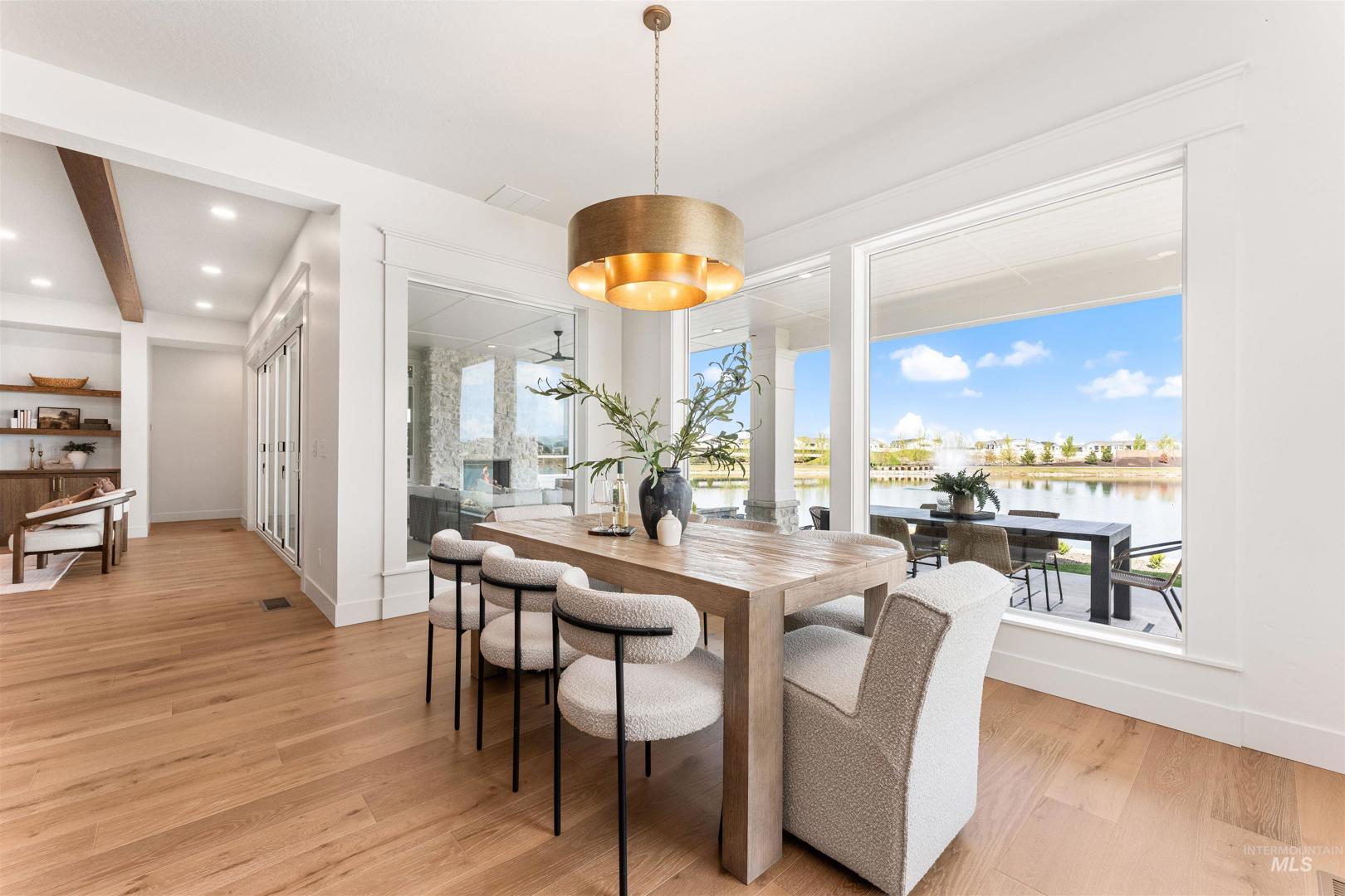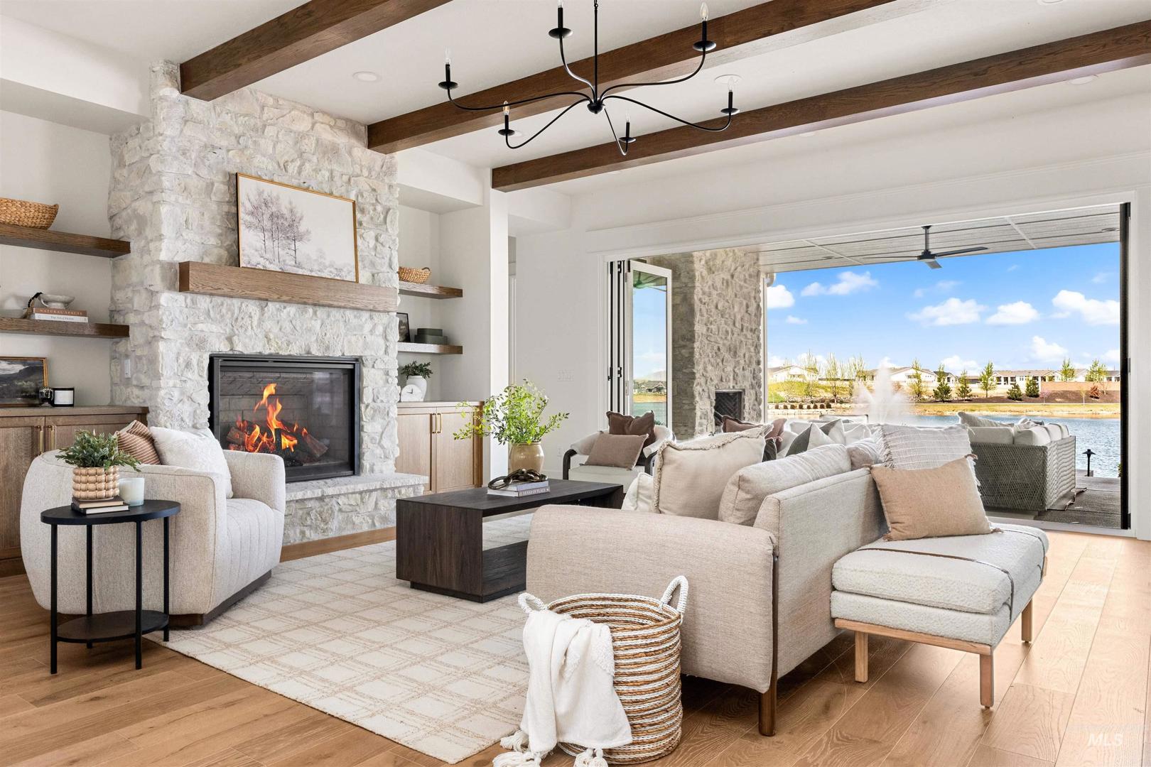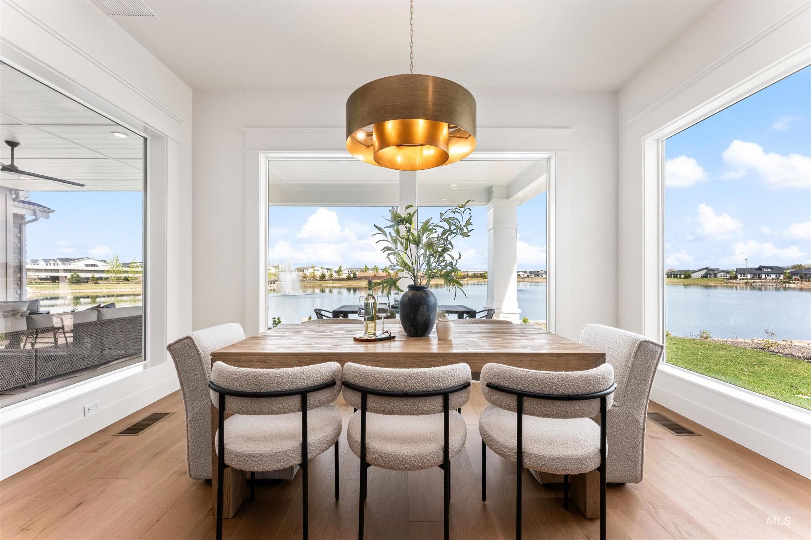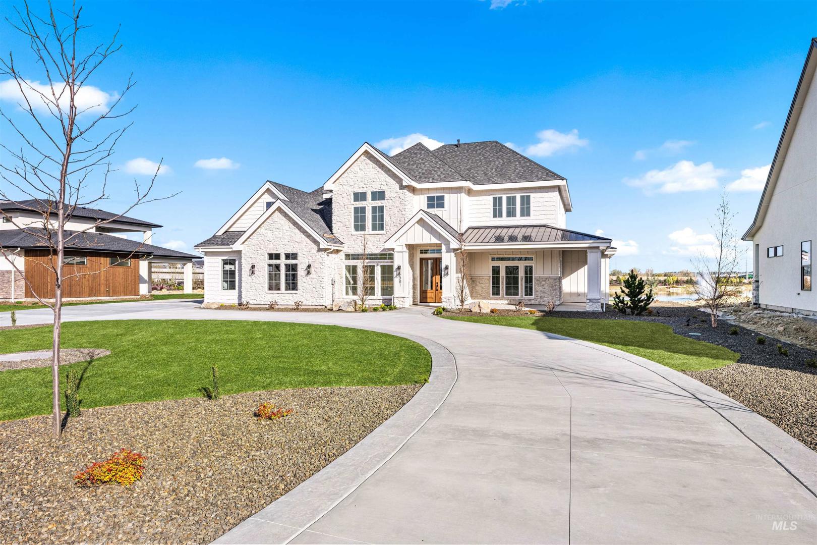 Welcome to the elevated Madison Floor Plan by Highland Homes, an exceptional two-level, waterfront home where thoughtful design meets luxury living. From the moment you enter, the layout blends comfort and sophistication, anchored by an expansive 12-foot kitchen island and a walk-through butler’s pantry that make this kitchen ideal for entertaining, complemented by a premier selection of Wolf and Sub-Zero appliances including a steam oven, built-in coffee maker, wine fridge, Sub-Zero refrigerator, and dual dishwashers. The private main-floor primary suite features a spa-inspired bathroom with direct access to the laundry room. Upstairs, you’ll find a spacious vaulted bonus room, two well-appointed bedrooms connected by a Jack-and-Jill bathroom, and a third bedroom with a private bath—perfect for guests. Enhancing the waterfront lifestyle, the planned upscale landscaping creates a private outdoor retreat with covered patio, ambient lighting, and direct water access, all set against unobstructed views of the Boise Foothills—perfect for both relaxation and entertaining.