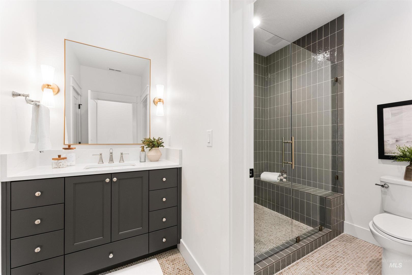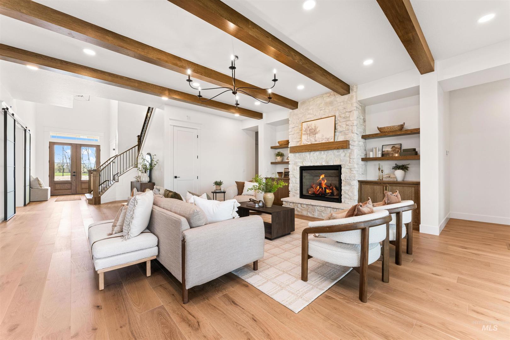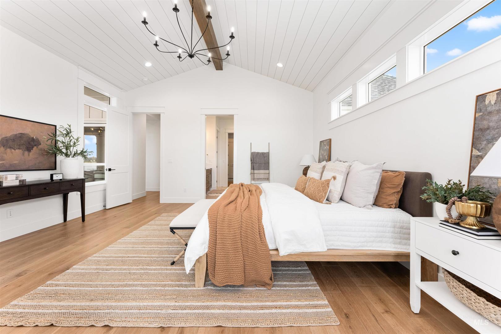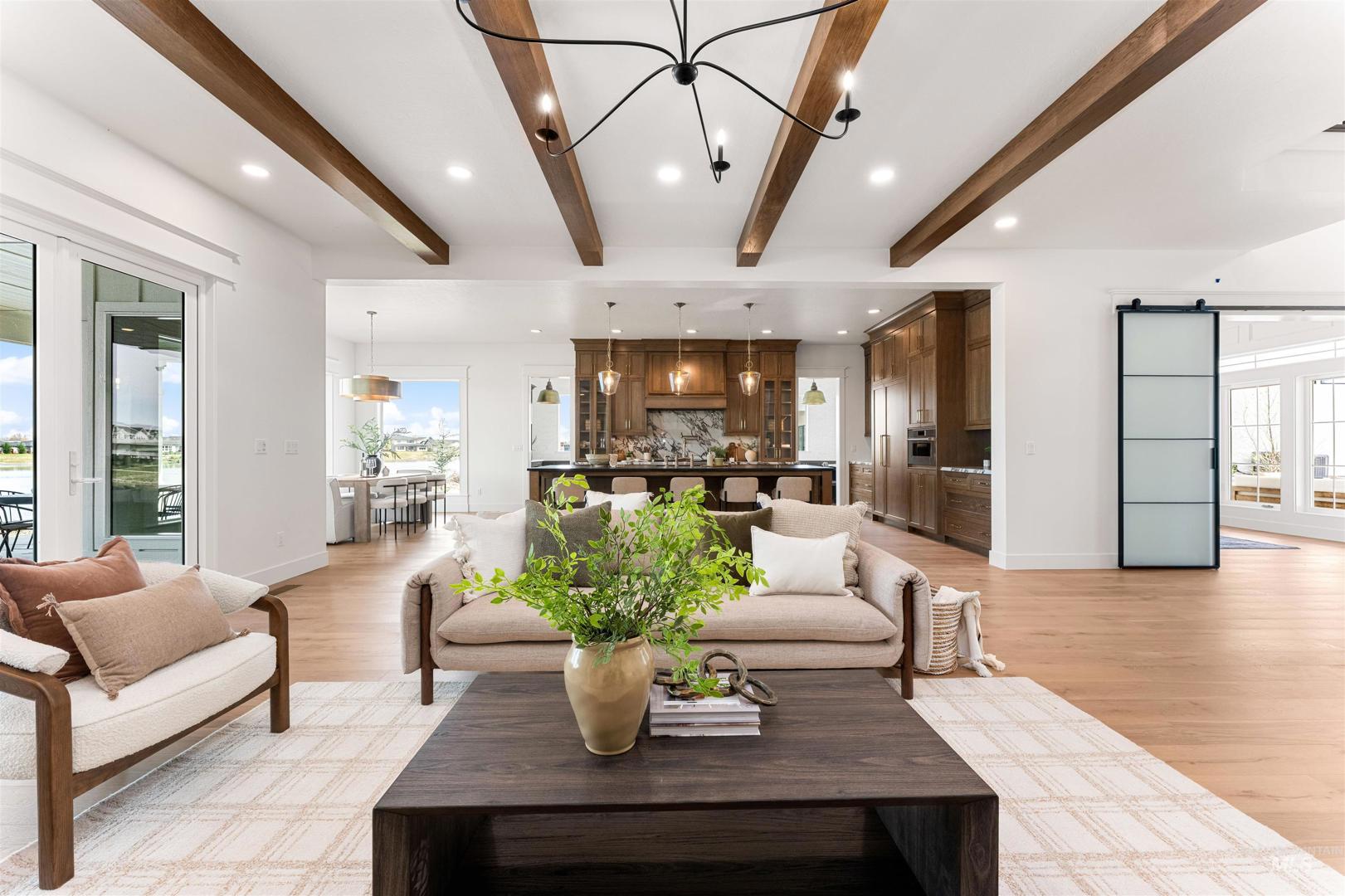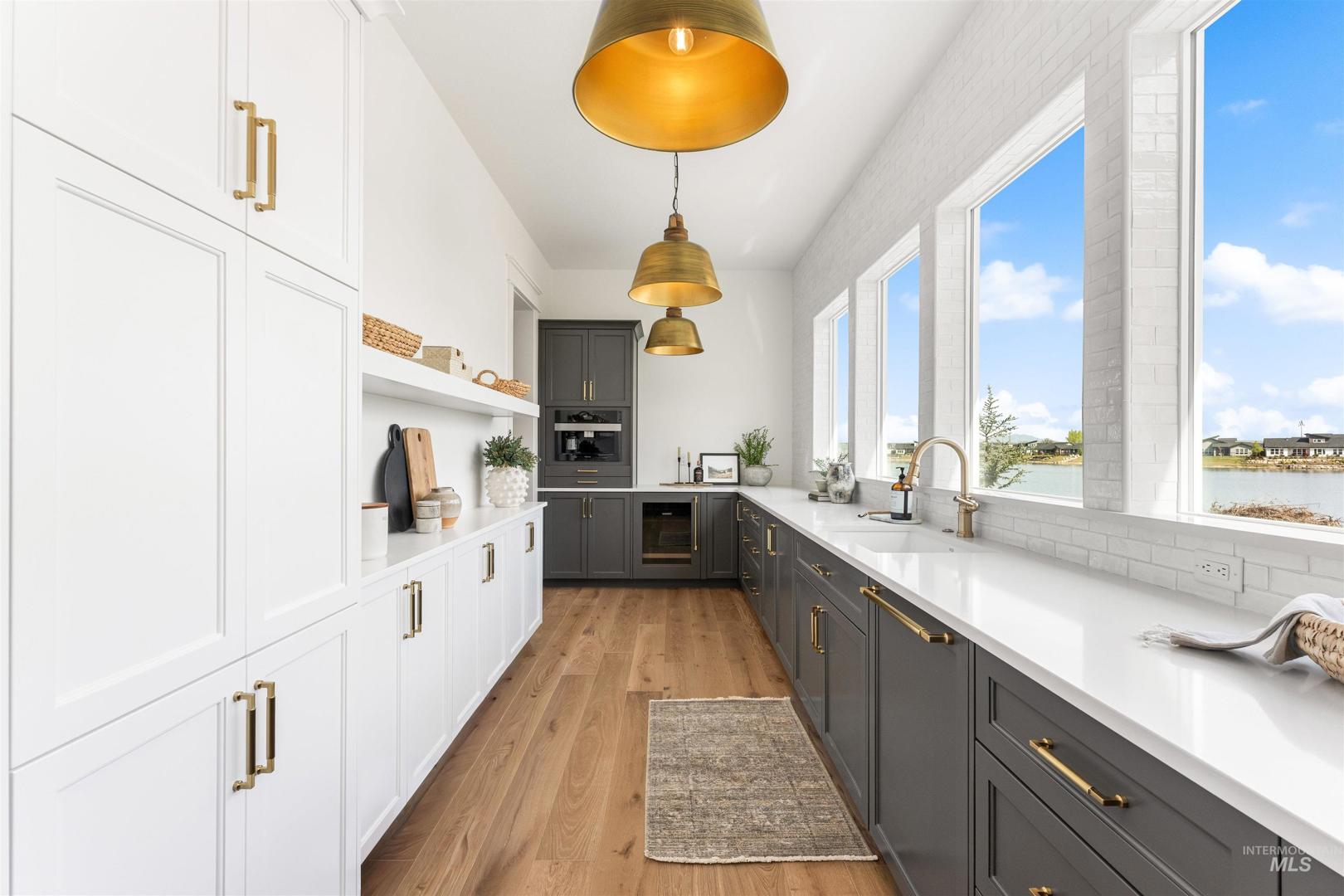 Welcome to the elevated Madison Floor Plan by Highland Homes, an exceptional two-level, waterfront home where thoughtful design meets luxury living. From the moment you enter, the layout blends comfort and sophistication, anchored by an expansive 12-foot kitchen island and a walk-through butler’s pantry that make this kitchen ideal for entertaining, complemented by a premier selection of Wolf and Sub-Zero appliances including a steam oven, built-in coffee maker, wine fridge, Sub-Zero refrigerator, and dual dishwashers. The private main-floor primary suite features a spa-inspired bathroom with direct access to the laundry room. Upstairs, you’ll find a spacious vaulted bonus room, two well-appointed bedrooms connected by a Jack-and-Jill bathroom, and a third bedroom with a private bath—perfect for guests. Enhancing the waterfront lifestyle, the planned upscale landscaping creates a private outdoor retreat with covered patio, ambient lighting, and direct water access, all set against unobstructed views of the Boise Foothills—perfect for both relaxation and entertaining.