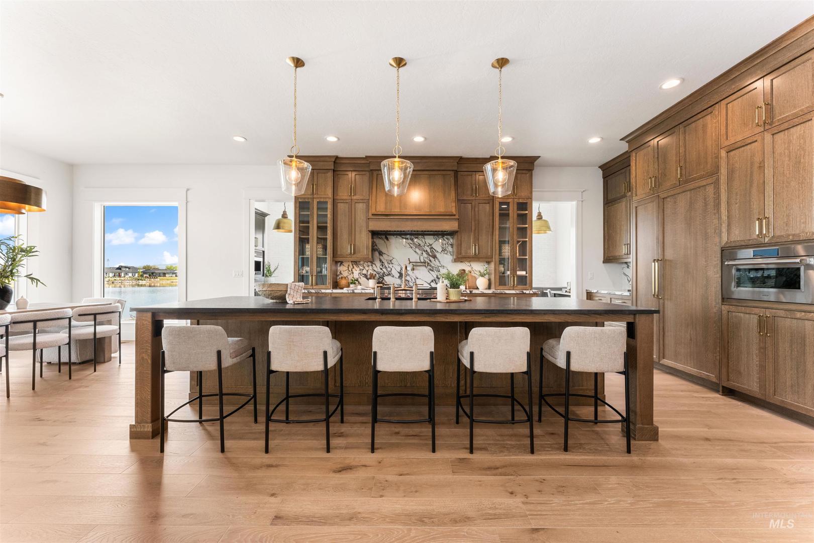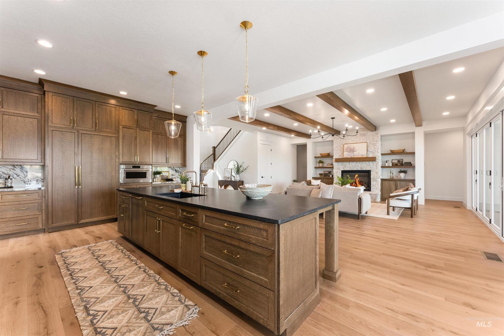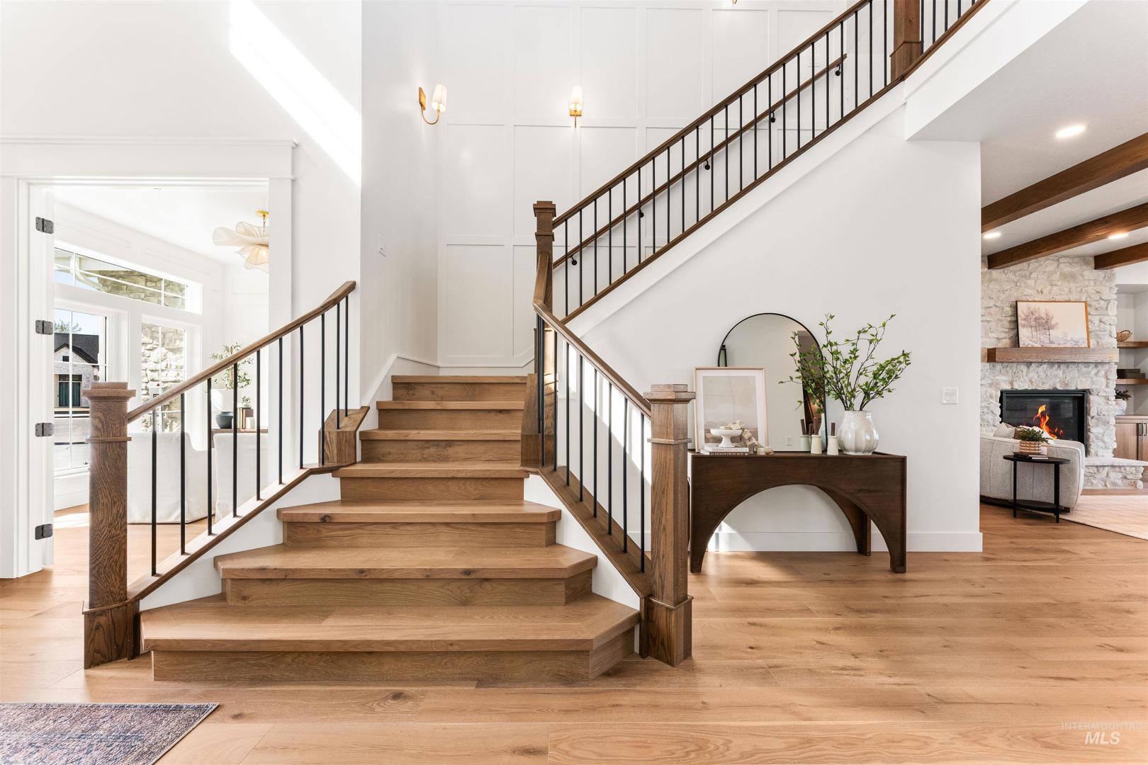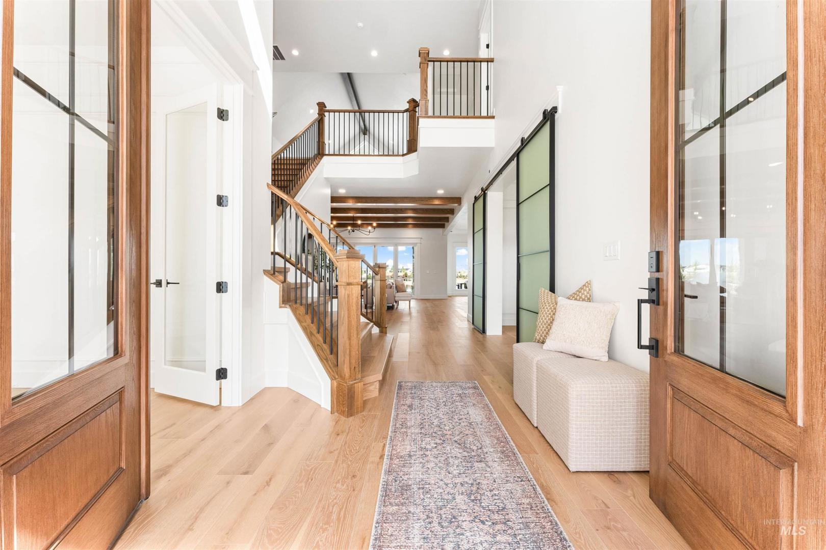 Welcome to the elevated Madison Floor Plan by Highland Homes, an exceptional two-level, waterfront home where thoughtful design meets luxury living. From the moment you enter, the layout blends comfort and sophistication, anchored by an expansive 12-foot kitchen island and a walk-through butler’s pantry that make this kitchen ideal for entertaining, complemented by a premier selection of Wolf and Sub-Zero appliances including a steam oven, built-in coffee maker, wine fridge, Sub-Zero refrigerator, and dual dishwashers. The private main-floor primary suite features a spa-inspired bathroom with direct access to the laundry room. Upstairs, you’ll find a spacious vaulted bonus room, two well-appointed bedrooms connected by a Jack-and-Jill bathroom, and a third bedroom with a private bath—perfect for guests. Enhancing the waterfront lifestyle, the planned upscale landscaping creates a private outdoor retreat with covered patio, ambient lighting, and direct water access, all set against unobstructed views of the Boise Foothills—perfect for both relaxation and entertaining.