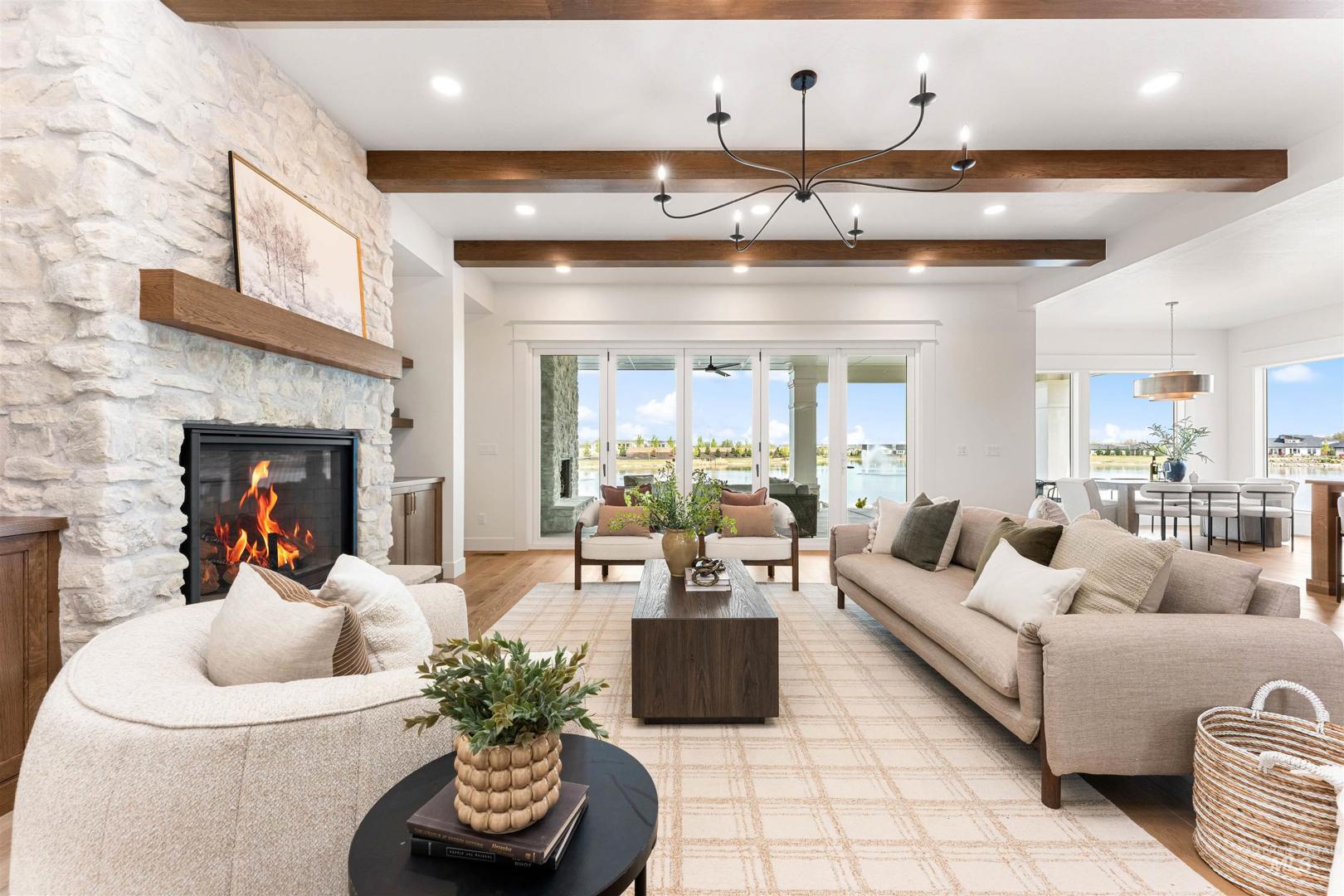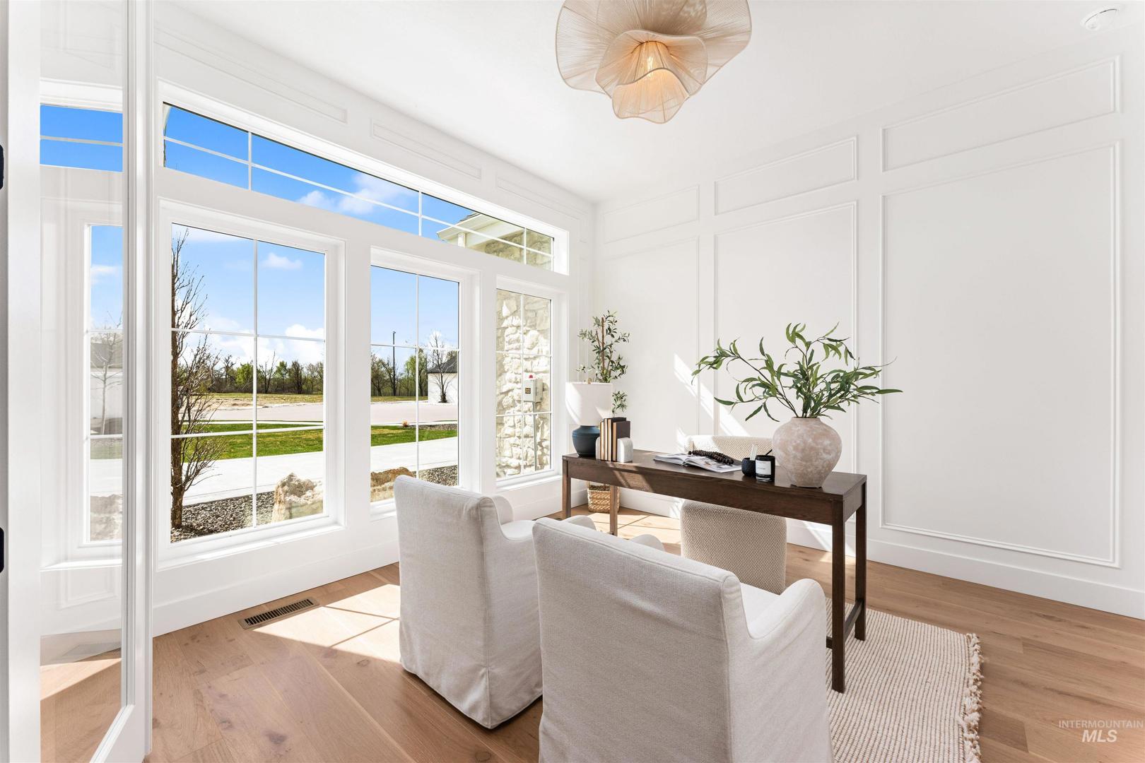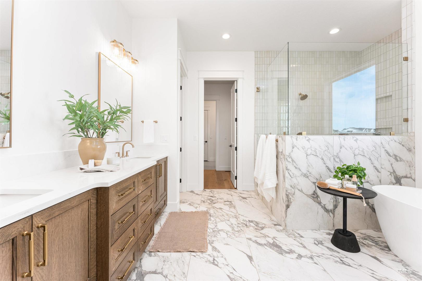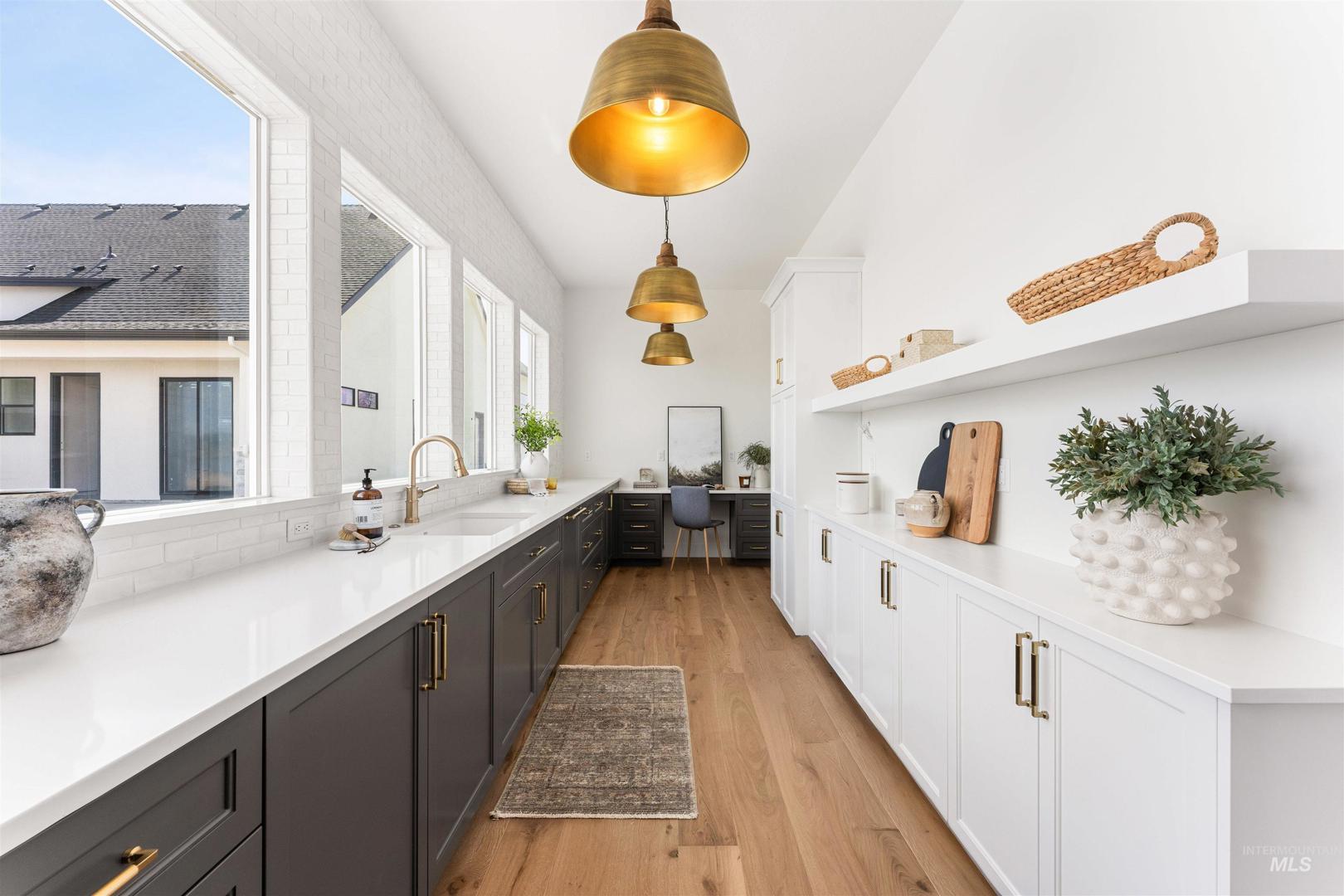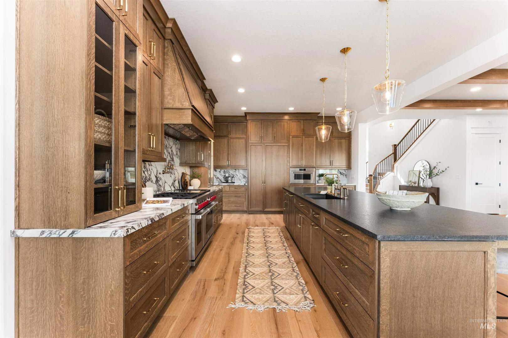 Welcome to the elevated Madison Floor Plan by Highland Homes, an exceptional two-level, waterfront home where thoughtful design meets luxury living. From the moment you enter, the layout blends comfort and sophistication, anchored by an expansive 12-foot kitchen island and a walk-through butler’s pantry that make this kitchen ideal for entertaining, complemented by a premier selection of Wolf and Sub-Zero appliances including a steam oven, built-in coffee maker, wine fridge, Sub-Zero refrigerator, and dual dishwashers. The private main-floor primary suite features a spa-inspired bathroom with direct access to the laundry room. Upstairs, you’ll find a spacious vaulted bonus room, two well-appointed bedrooms connected by a Jack-and-Jill bathroom, and a third bedroom with a private bath—perfect for guests. Enhancing the waterfront lifestyle, the planned upscale landscaping creates a private outdoor retreat with covered patio, ambient lighting, and direct water access, all set against unobstructed views of the Boise Foothills—perfect for both relaxation and entertaining.