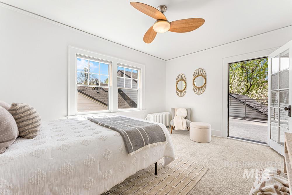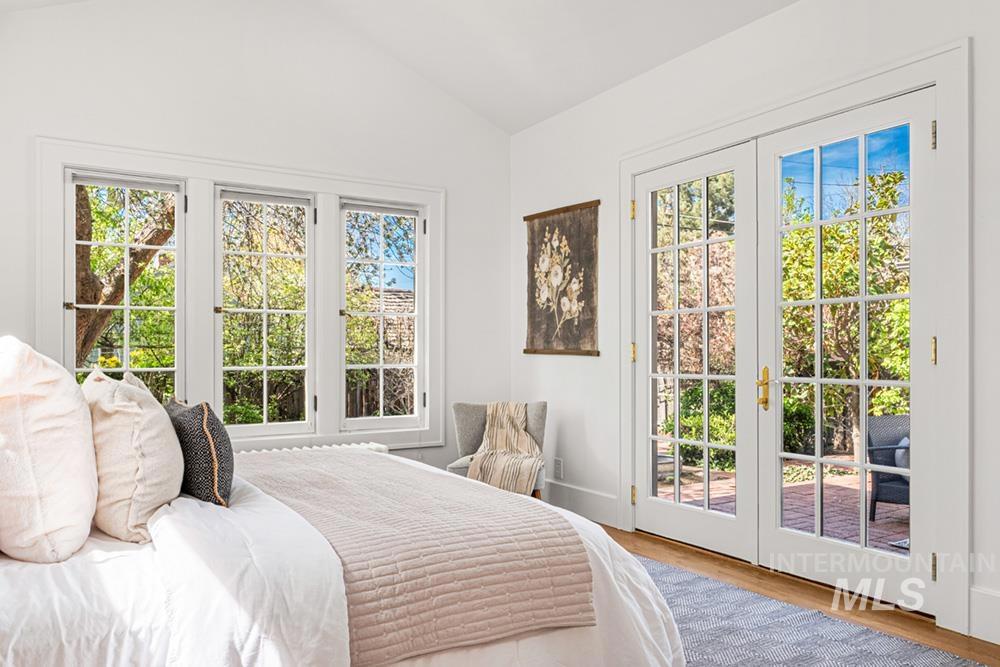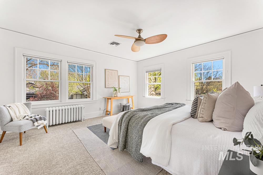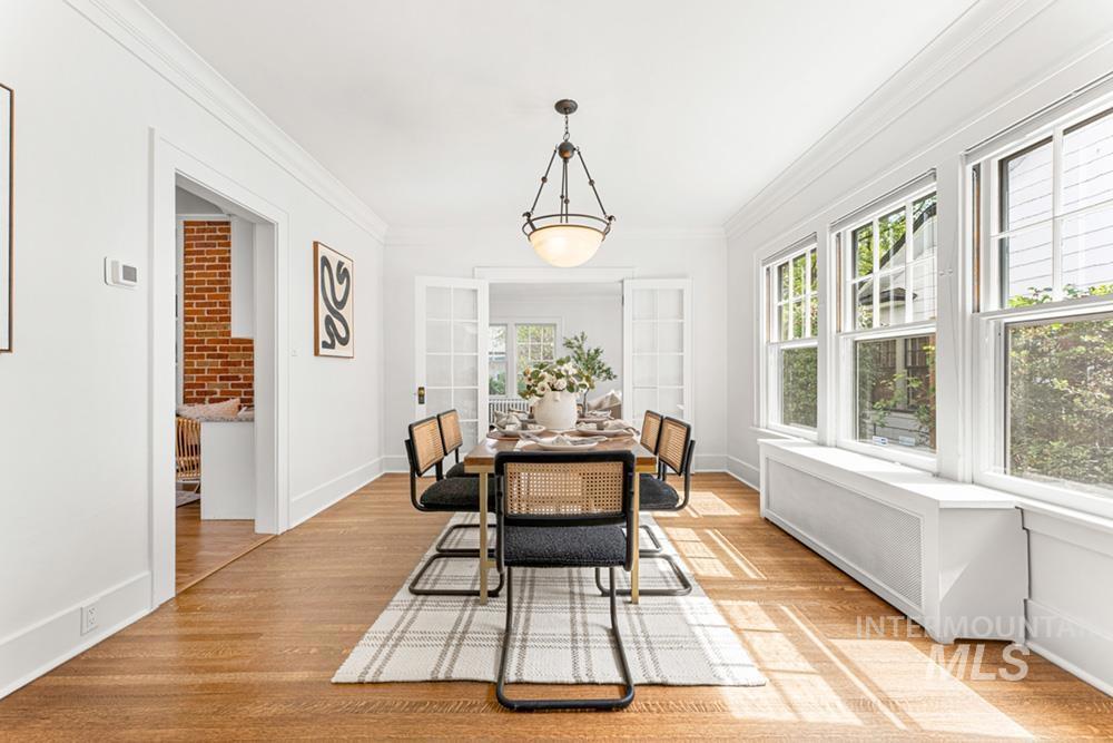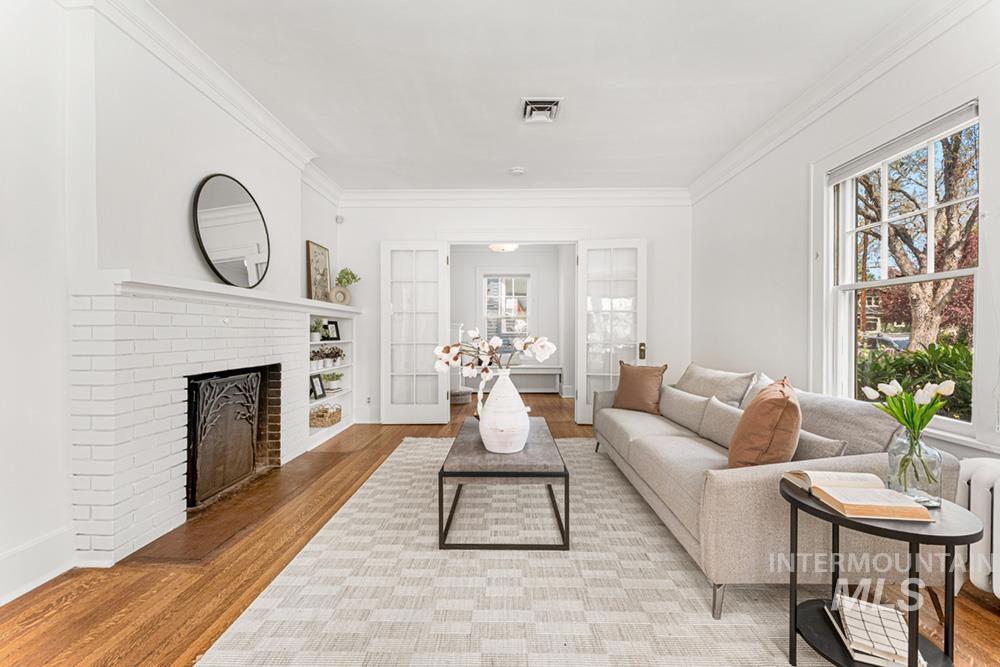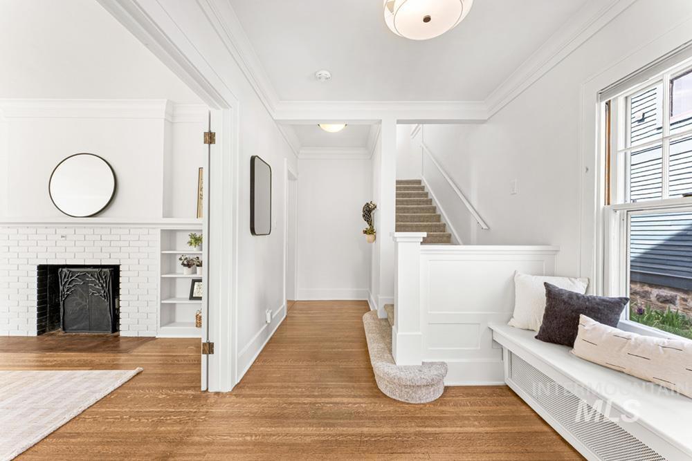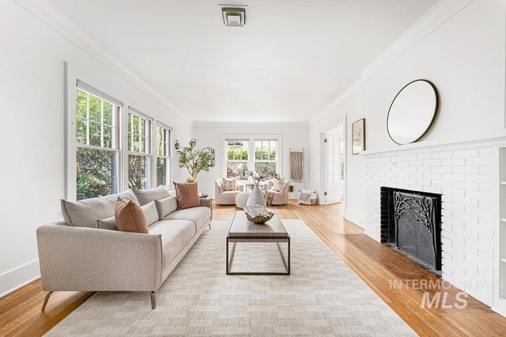 A spacious 1920s Foursquare, set along an idyllic street in the North End! With classic curb appeal, the residence feels right at home in this historic neighborhood. Inside, hardwood floors & original trim extend throughout. The formal living room is accented by a brick fireplace, while formal dining invites connection over home-cooked meals. The kitchen is beautifully bright, wrapped in windows, and thoughtfully updated with stainless steel appliances. A main-level wing offers a secluded primary suite with vaulted ceilings & private bath. Upstairs, three bedrooms, one with ensuite & balcony, offer generous size & ample closet space. A full bath in the hallway features dual vanity & classic tile. Don’t miss the staircase from the upper level to the spacious attic – perfect for storage or creating additional finished play space! The lower level adds desirable flexibility & square footage, warmed by wood beams, stone fireplace & natural light. Outside, a brick patio sits under lush trees, with garden beds, greenery, and areas to gather or relax. An unbeatable location, moments from neighborhood parks, highly ranked Boise schools, and fabulous Hyde Park dining & coffee shops. It is the kind of street & setting that define the North End lifestyle, with foothill trails, river access, & downtown convenience all within reach.