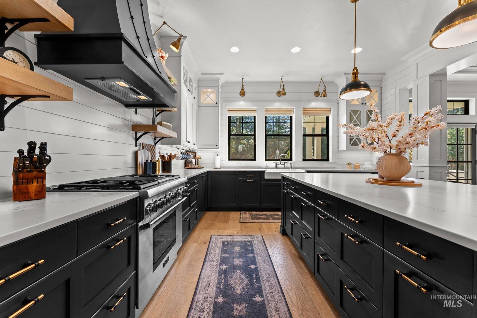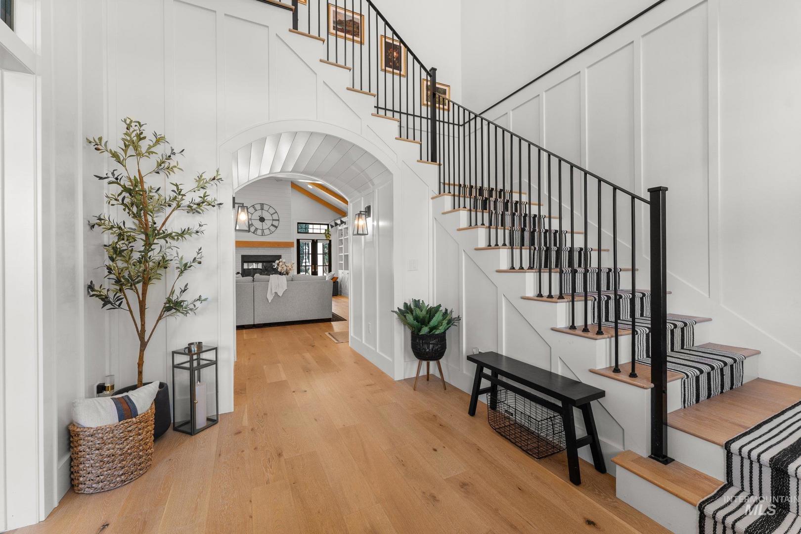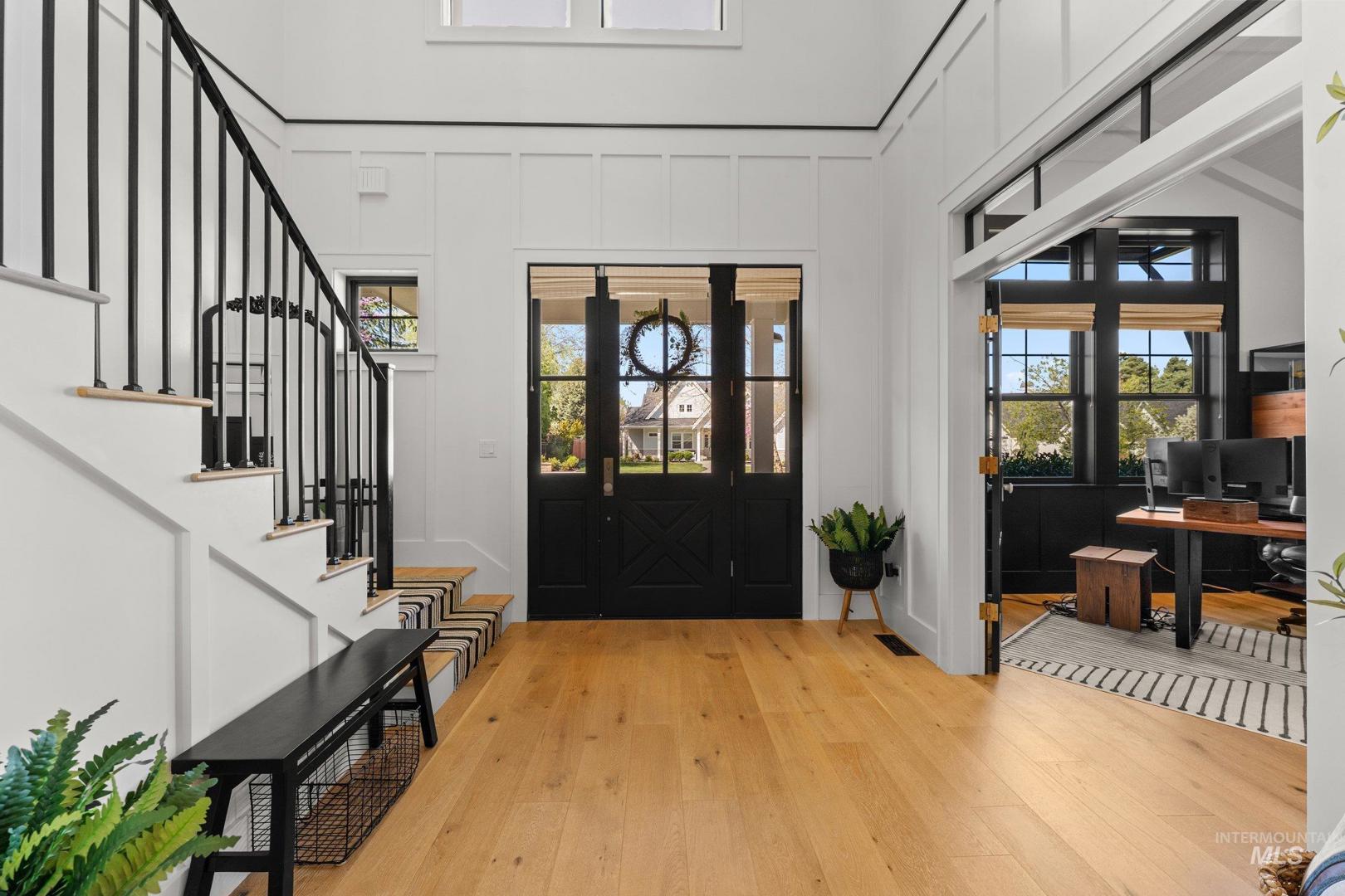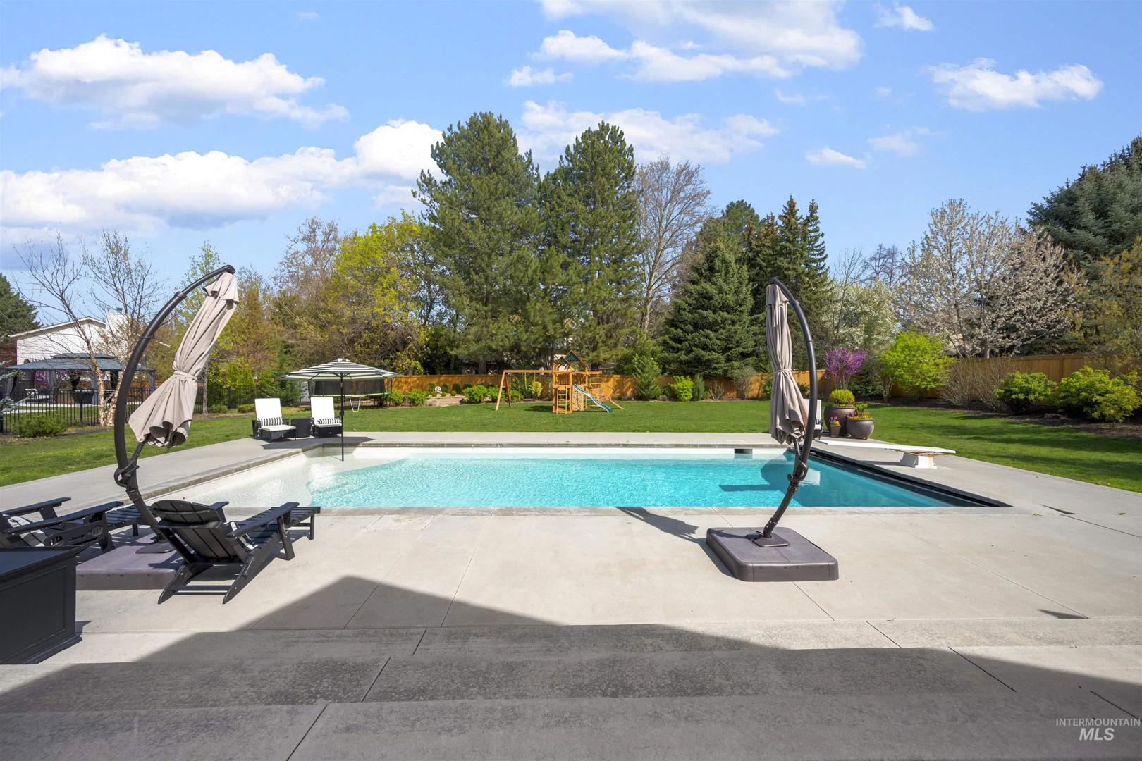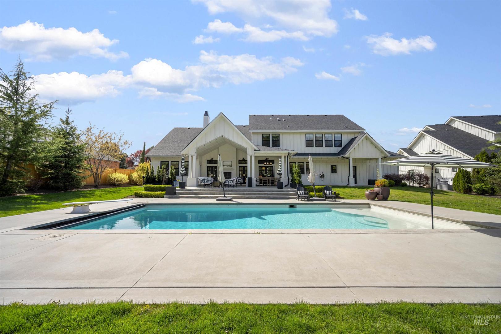 Former Parade Home in The Hickories offering exceptional craftsmanship and thoughtful design throughout. Situated on a private cul-de-sac on a .64-acre lot in a prime location near where Boise, Meridian, and Eagle converge, this home blends luxury with everyday livability. Grand 23’ tall entry, wide plank hardwood flooring, 8’ doors with glass pane details, and Emtek hardware set the tone. The kitchen features a full Thermador appliance suite including steam convection oven, 6 burner range with grill, custom cabinetry with integrated lighting, 8.5’ island, and a butler’s pantry with glass pane details. Custom wall treatments and detailed millwork are carried throughout, including a stunning primary suite with steam shower, soaking tub, motorized blackout blinds, and full shiplap detailing. Flexible spaces include a 25’ bonus room, three reading nooks, under stair playroom, and a craft and laundry room with a 7’ table, sink, and built ins. The gorgeous backyard was thoughtfully designed for both relaxation and entertaining with a heated saltwater pool, sun shelf, water features, diving board, and 29’ covered patio. High end systems include whole home generator, water filtration, whole house humidifier, Lutron lighting, and whole home audio.