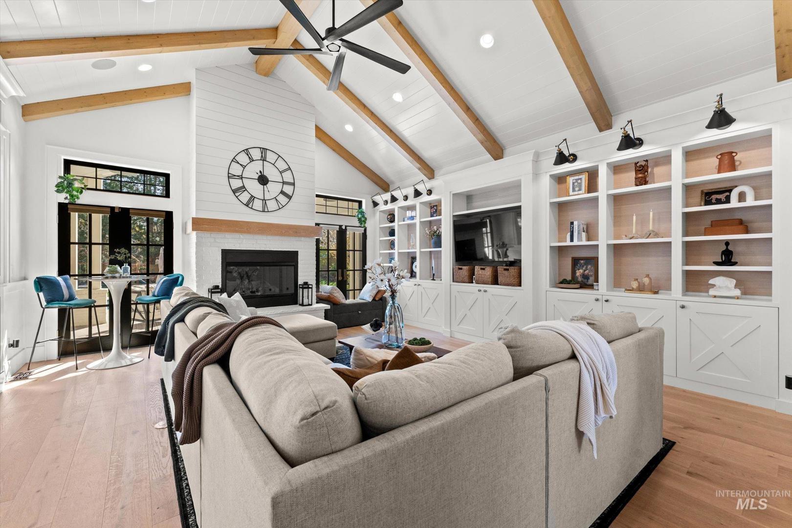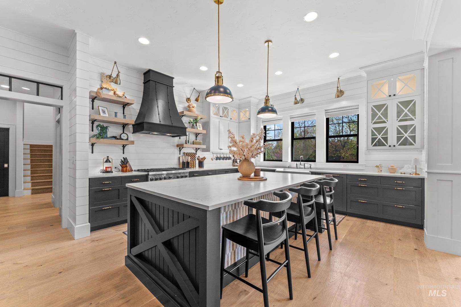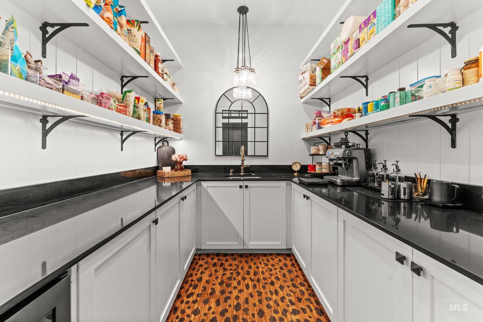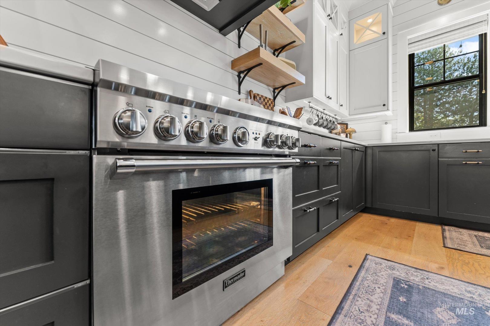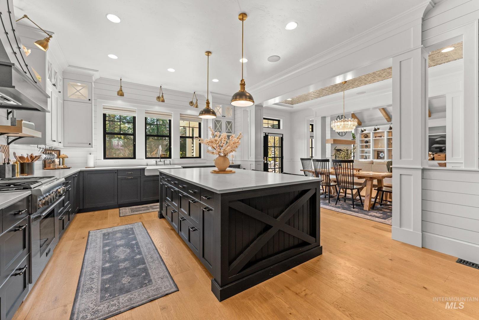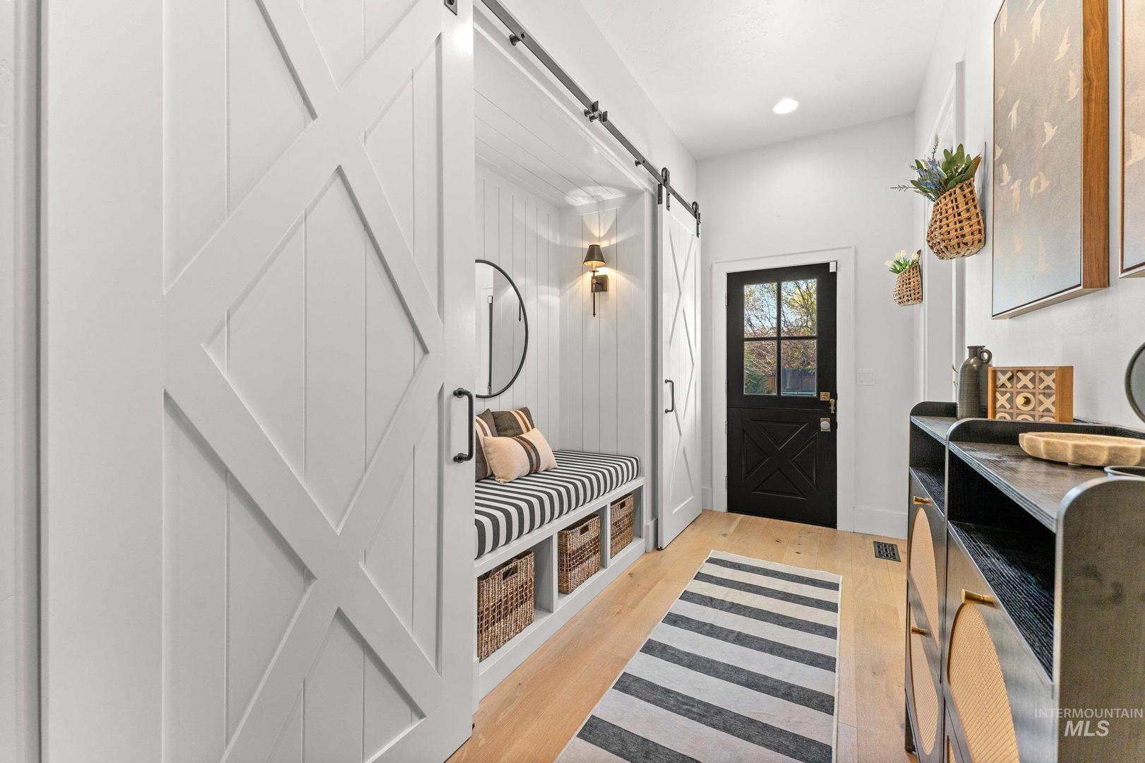 Former Parade Home in The Hickories offering exceptional craftsmanship and thoughtful design throughout. Situated on a private cul-de-sac on a .64-acre lot in a prime location near where Boise, Meridian, and Eagle converge, this home blends luxury with everyday livability. Grand 23’ tall entry, wide plank hardwood flooring, 8’ doors with glass pane details, and Emtek hardware set the tone. The kitchen features a full Thermador appliance suite including steam convection oven, 6 burner range with grill, custom cabinetry with integrated lighting, 8.5’ island, and a butler’s pantry with glass pane details. Custom wall treatments and detailed millwork are carried throughout, including a stunning primary suite with steam shower, soaking tub, motorized blackout blinds, and full shiplap detailing. Flexible spaces include a 25’ bonus room, three reading nooks, under stair playroom, and a craft and laundry room with a 7’ table, sink, and built ins. The gorgeous backyard was thoughtfully designed for both relaxation and entertaining with a heated saltwater pool, sun shelf, water features, diving board, and 29’ covered patio. High end systems include whole home generator, water filtration, whole house humidifier, Lutron lighting, and whole home audio.