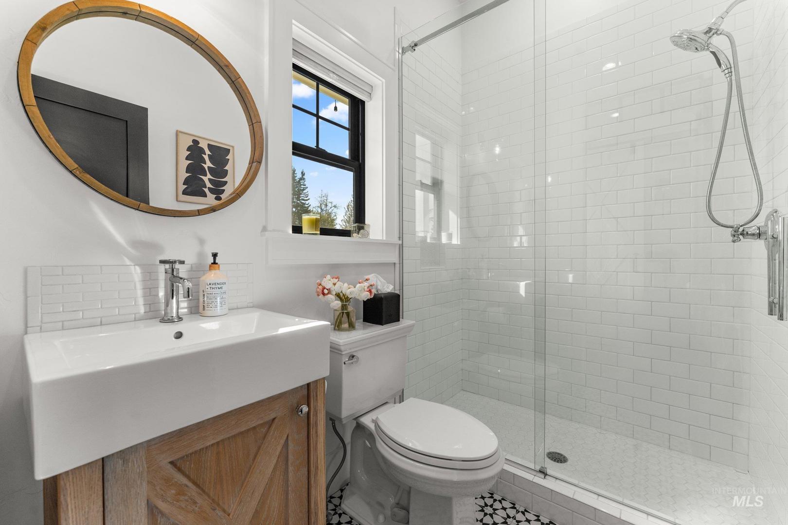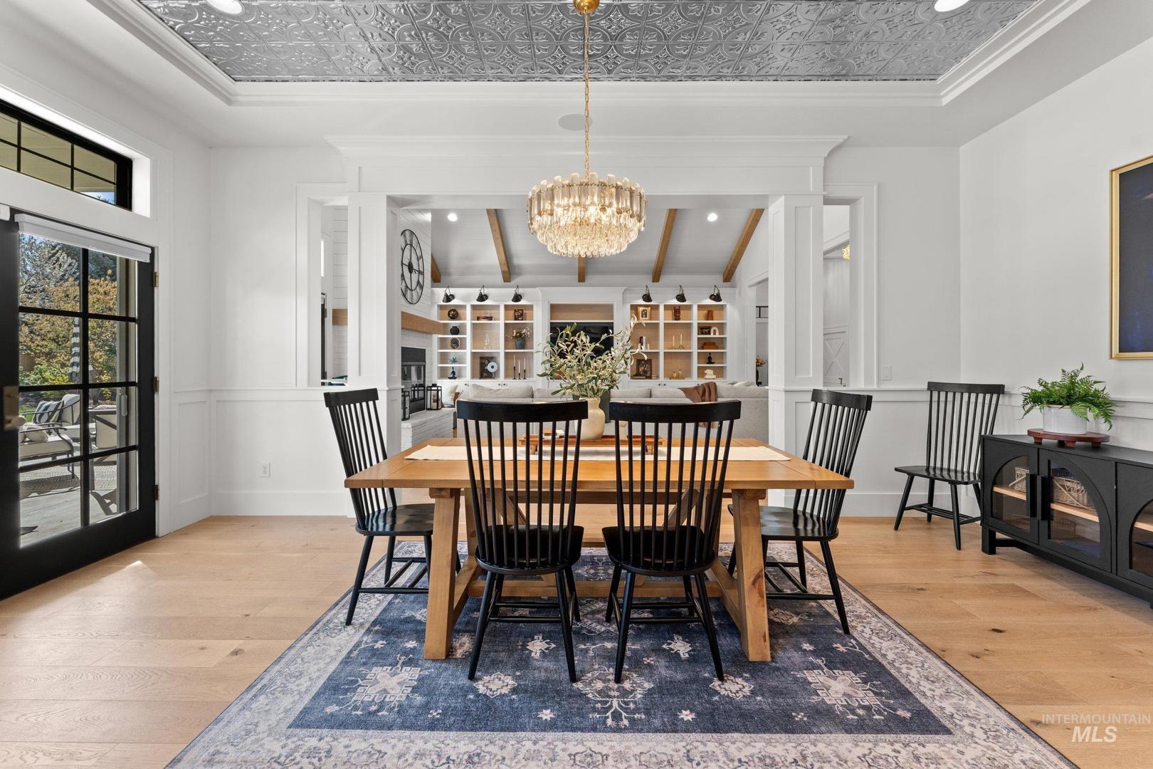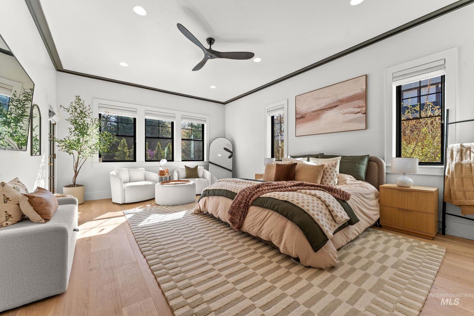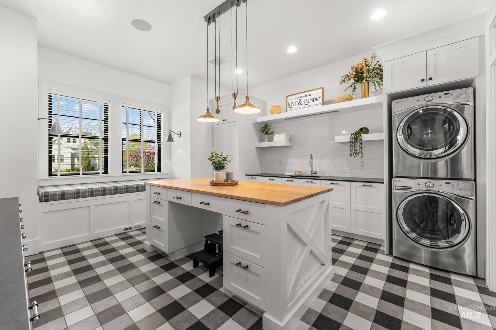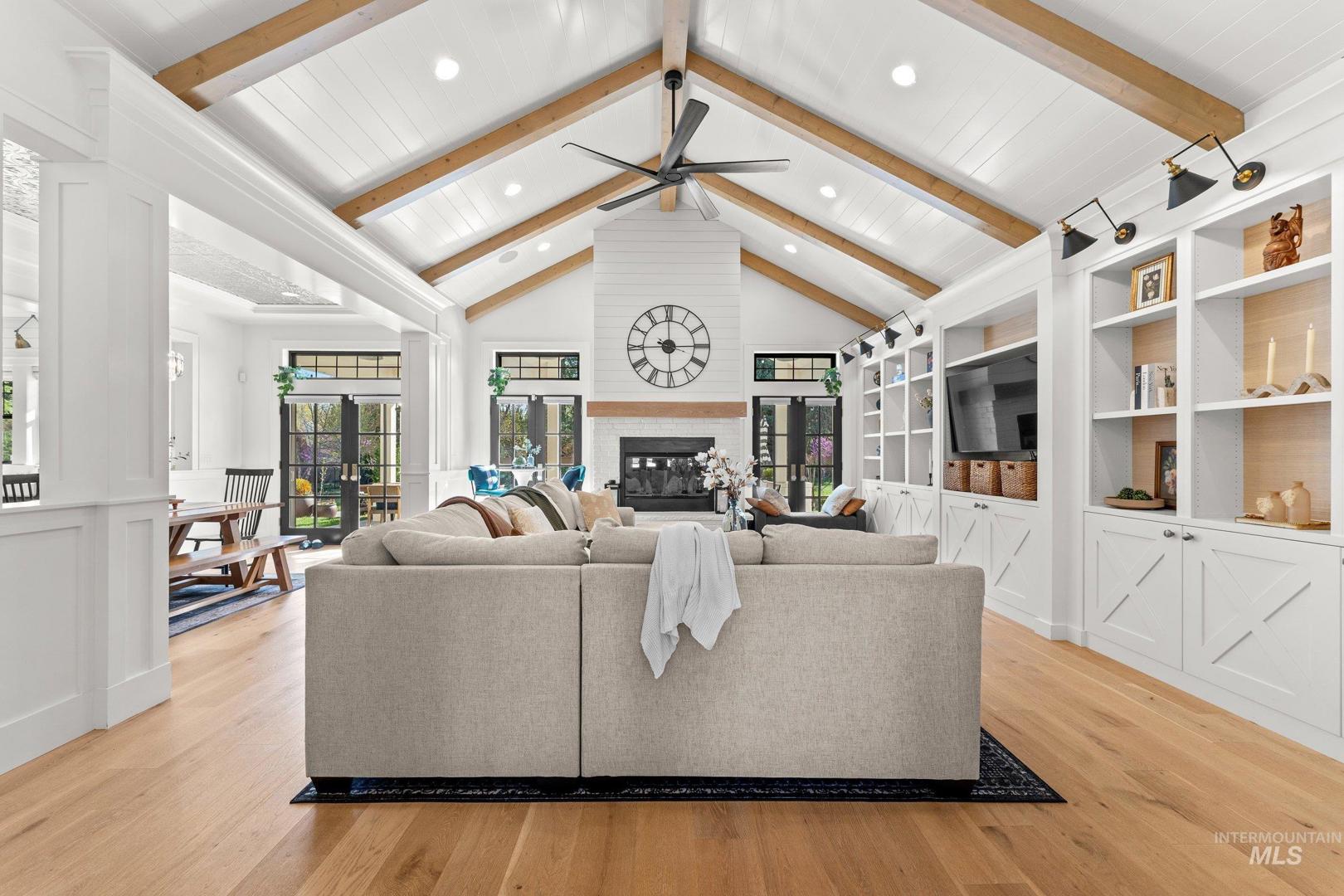 Former Parade Home in The Hickories offering exceptional craftsmanship and thoughtful design throughout. Situated on a private cul-de-sac on a .64-acre lot in a prime location near where Boise, Meridian, and Eagle converge, this home blends luxury with everyday livability. Grand 23’ tall entry, wide plank hardwood flooring, 8’ doors with glass pane details, and Emtek hardware set the tone. The kitchen features a full Thermador appliance suite including steam convection oven, 6 burner range with grill, custom cabinetry with integrated lighting, 8.5’ island, and a butler’s pantry with glass pane details. Custom wall treatments and detailed millwork are carried throughout, including a stunning primary suite with steam shower, soaking tub, motorized blackout blinds, and full shiplap detailing. Flexible spaces include a 25’ bonus room, three reading nooks, under stair playroom, and a craft and laundry room with a 7’ table, sink, and built ins. The gorgeous backyard was thoughtfully designed for both relaxation and entertaining with a heated saltwater pool, sun shelf, water features, diving board, and 29’ covered patio. High end systems include whole home generator, water filtration, whole house humidifier, Lutron lighting, and whole home audio.