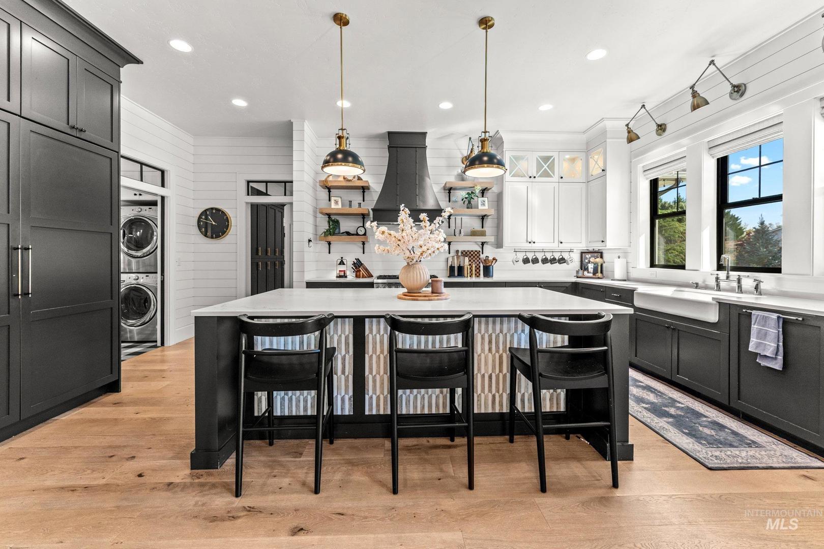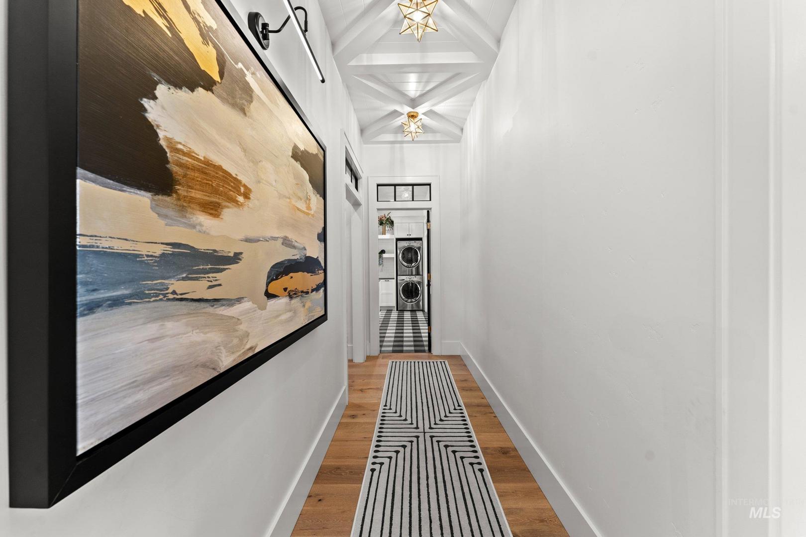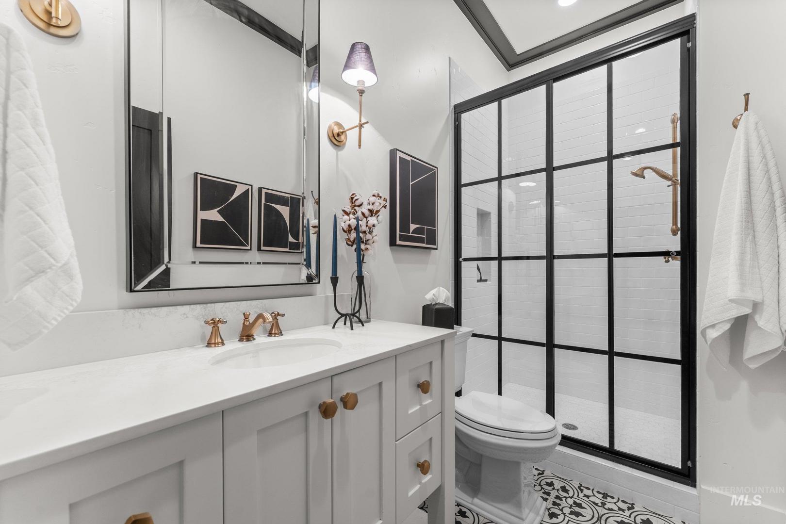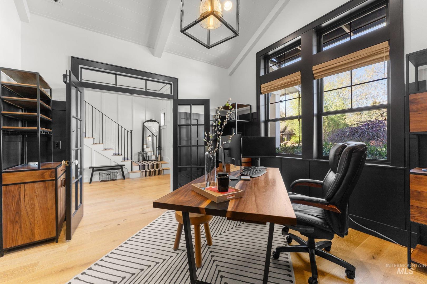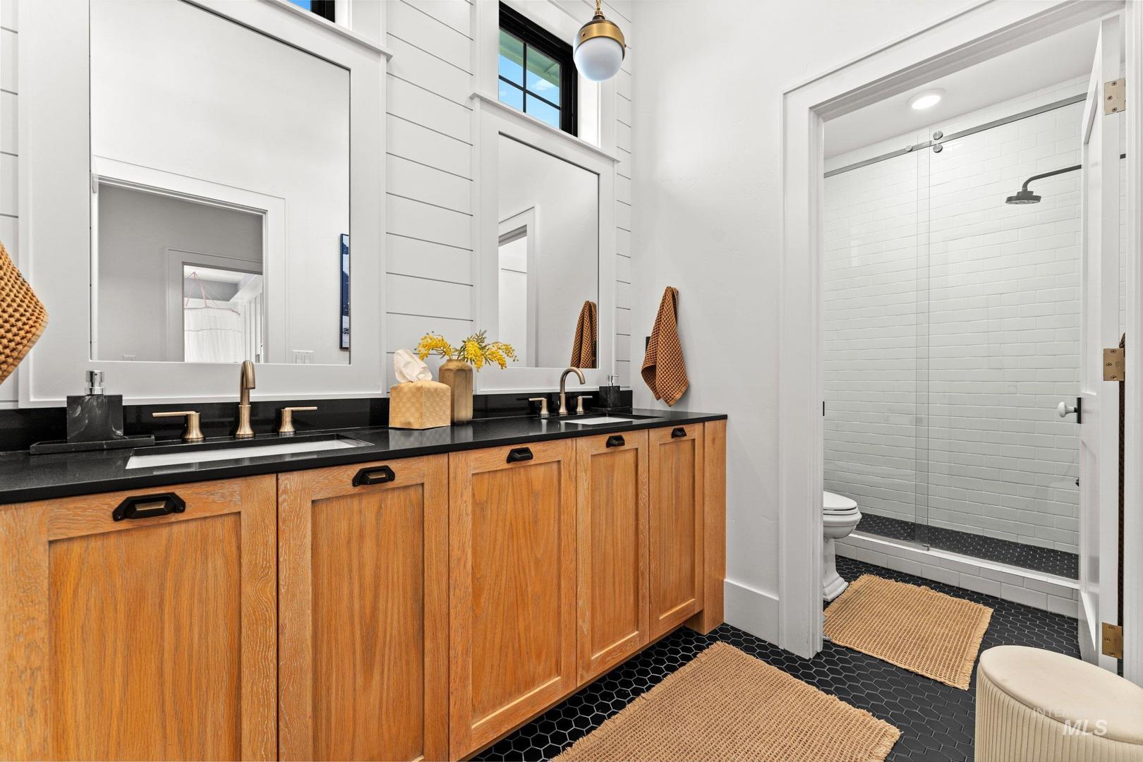 Former Parade Home in The Hickories offering exceptional craftsmanship and thoughtful design throughout. Situated on a private cul-de-sac on a .64-acre lot in a prime location near where Boise, Meridian, and Eagle converge, this home blends luxury with everyday livability. Grand 23’ tall entry, wide plank hardwood flooring, 8’ doors with glass pane details, and Emtek hardware set the tone. The kitchen features a full Thermador appliance suite including steam convection oven, 6 burner range with grill, custom cabinetry with integrated lighting, 8.5’ island, and a butler’s pantry with glass pane details. Custom wall treatments and detailed millwork are carried throughout, including a stunning primary suite with steam shower, soaking tub, motorized blackout blinds, and full shiplap detailing. Flexible spaces include a 25’ bonus room, three reading nooks, under stair playroom, and a craft and laundry room with a 7’ table, sink, and built ins. The gorgeous backyard was thoughtfully designed for both relaxation and entertaining with a heated saltwater pool, sun shelf, water features, diving board, and 29’ covered patio. High end systems include whole home generator, water filtration, whole house humidifier, Lutron lighting, and whole home audio.