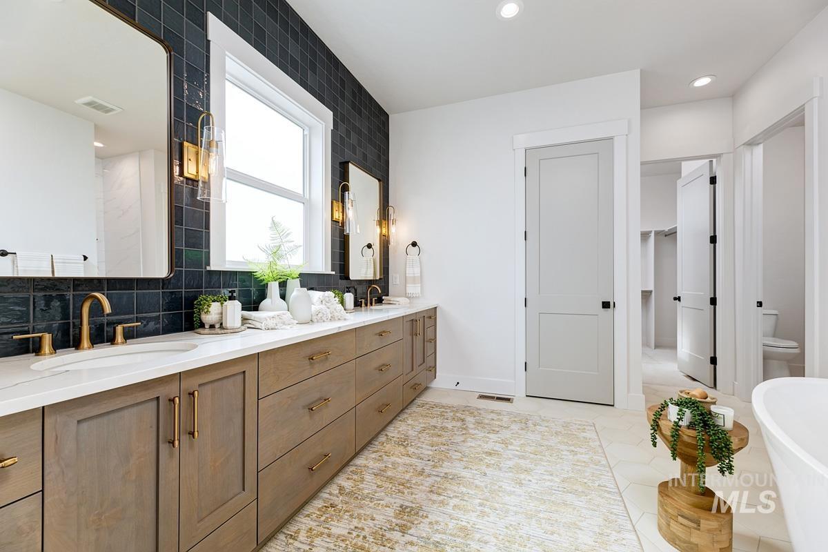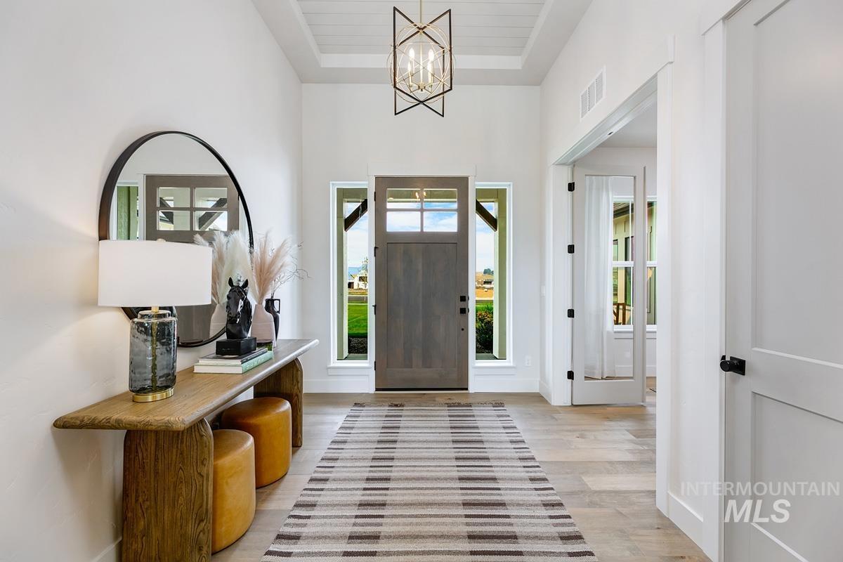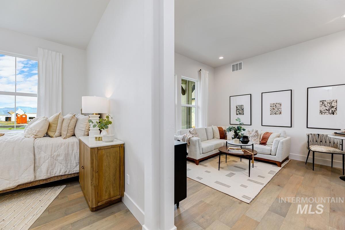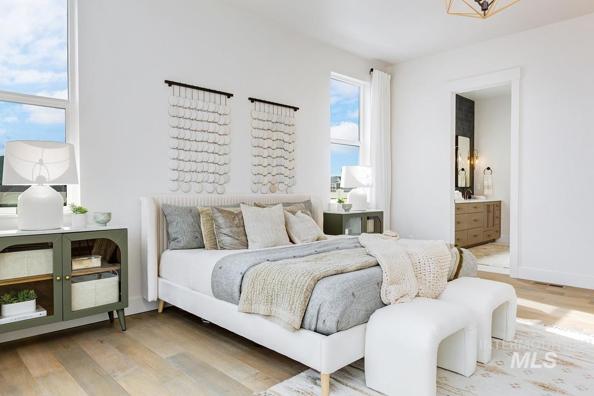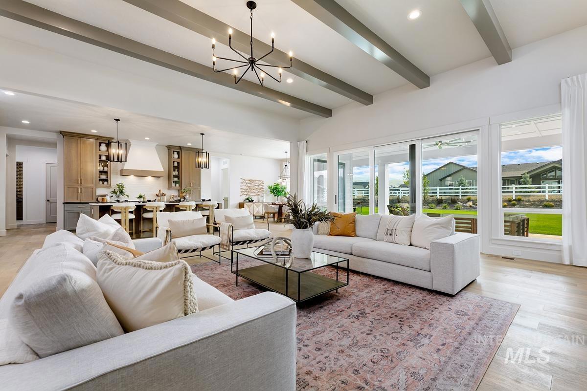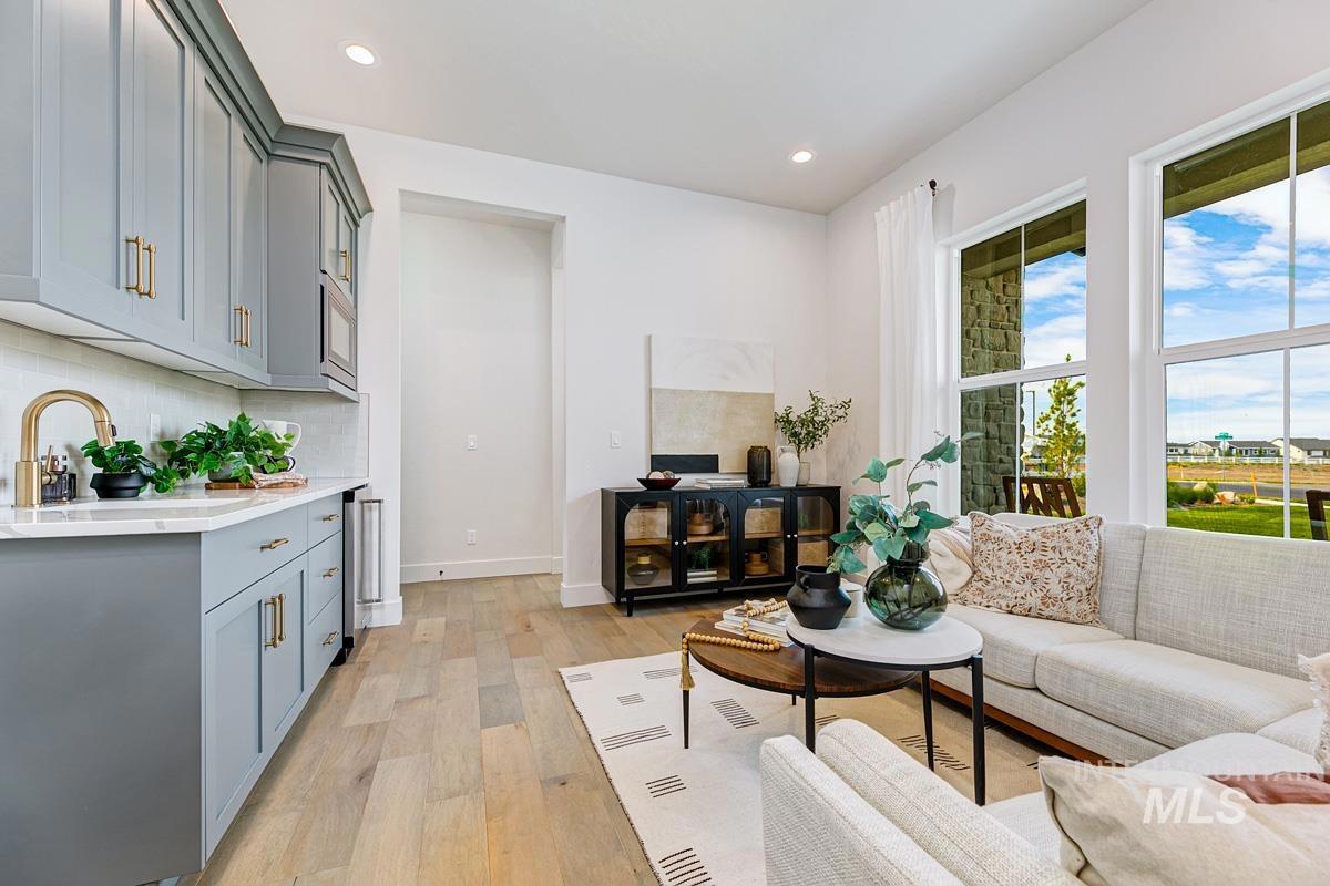 This Amethyst home makes a bold statement with stunning curb appeal and striking design, all set on a spacious almost half-acre homesite with views of the mountains and Stack Rock. The 3-car side-load garage enhances the grand entry beneath a large, covered porch. Step inside to an elongated foyer, with a double-door office to your left, and continue into one of the largest great rooms we offer—featuring towering windows and a statement fireplace. The kitchen is equally impressive, offering sprawling countertops and an oversized pantry. The primary suite includes tall windows overlooking the backyard, along with a soaker tub and a tiled walk-in shower. A guest suite next to the flex room provides a variety of living options to suit your needs. Now open, the Dry Creek Ranch Community Clubhouse spans five manicured acres, featuring sports courts, a pool, and a 8,840 sqft. clubhouse w/ state-of-the-art amenities. Located in the Eagle Foothills minutes from the best Idaho has to offer, including local dining, shopping, and outdoor recreation. Home is to be built. Photos similar. Taxes are not yet assessed and to be determined by Ada County.