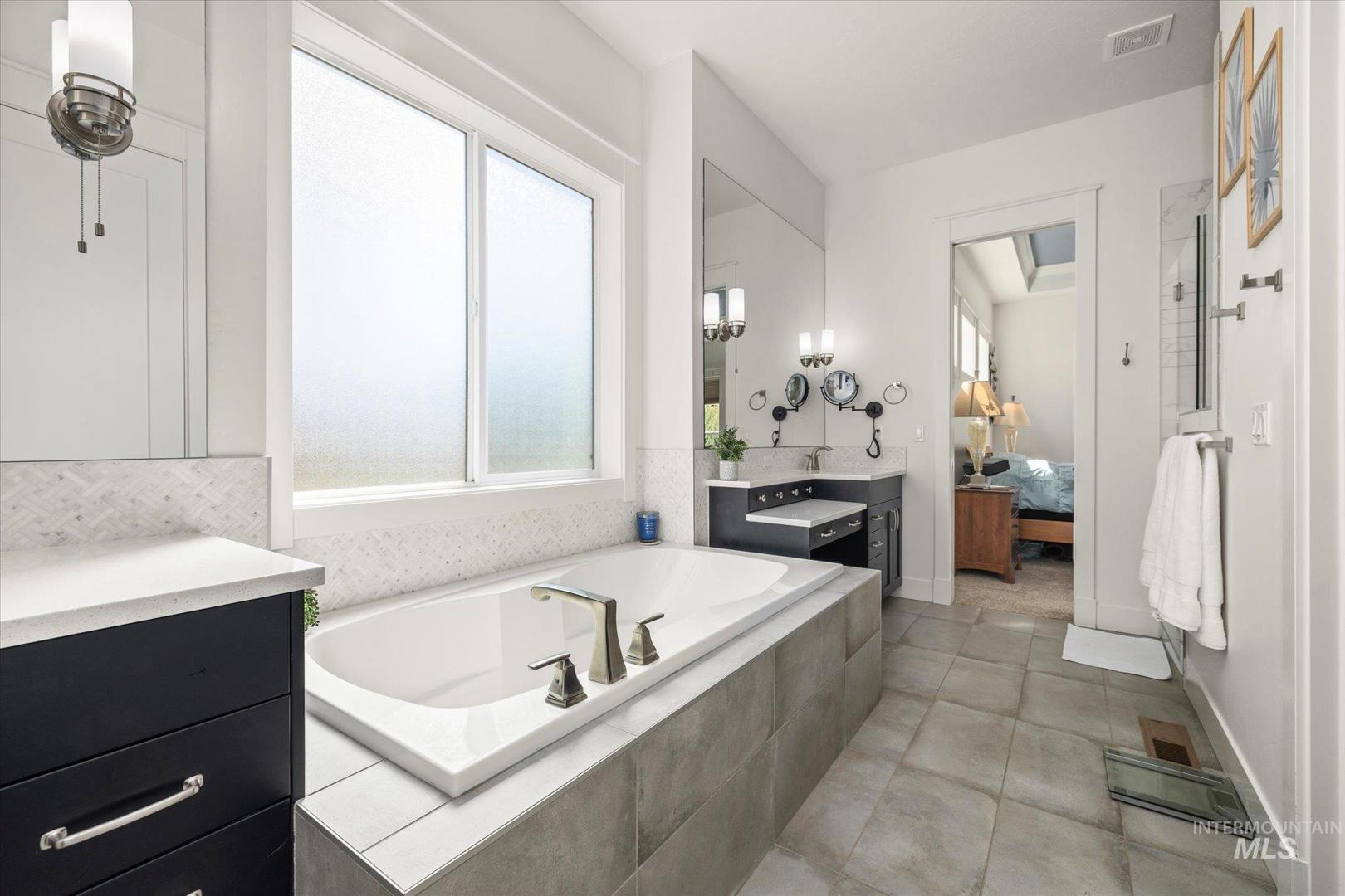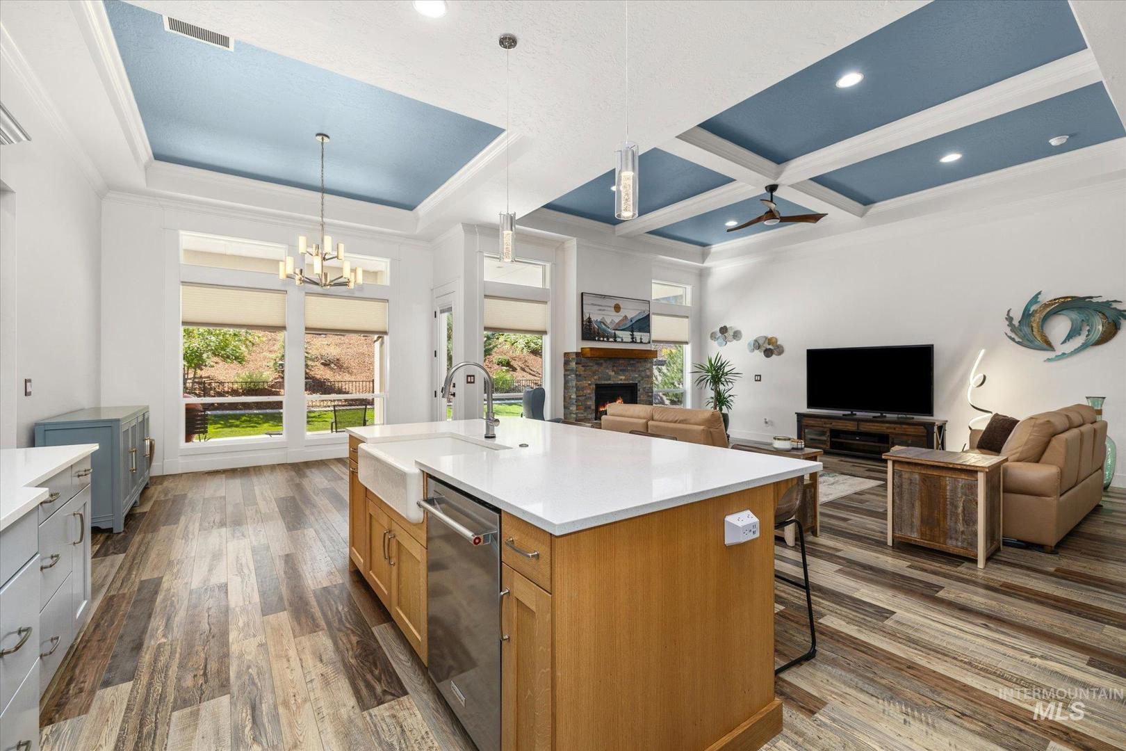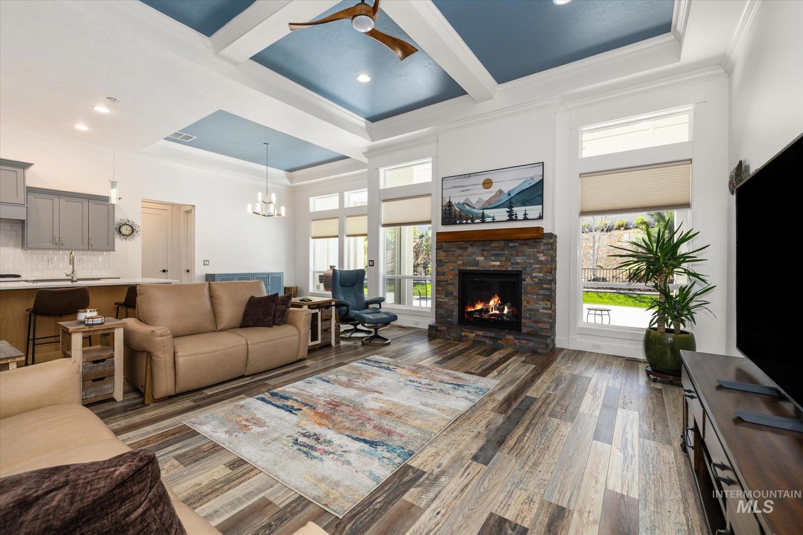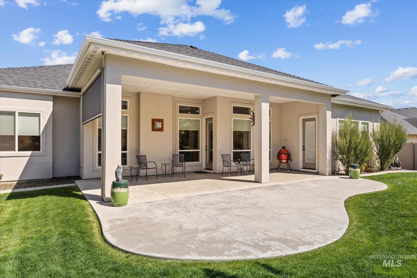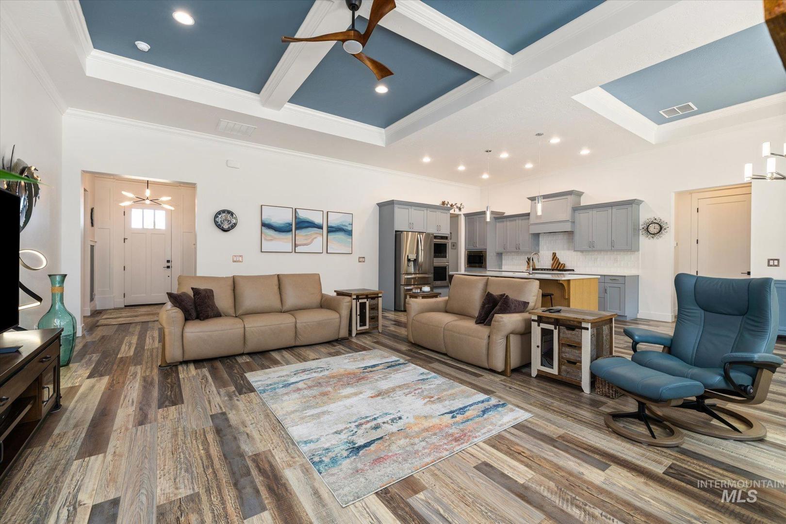 Immaculate luxury living in coveted Caven Ridge Estates with an exceptional RV bay! Striking great room with soaring ceilings, expansive windows, and a custom fireplace with remote control. Beautifully updated with fresh interior paint, updated flooring and new stainless steel double ovens, dishwasher, and refrigerator. Designed for both elegance and functionality, this single-level home features a spacious bonus room and a dedicated office. The gourmet kitchen impresses with quartz countertops, soft-close cabinetry, double ovens, and a generous walk-in pantry. The serene primary suite is filled with natural light and offers a spa-like bath with soaker tub, split dual vanities, and a tile walk-in shower. Enjoy effortless indoor-outdoor living on the covered patio with automatic shade—perfect for entertaining or relaxing. The oversized 3-car garage includes a rare RV bay (12’H x 12’W door 40’ deep bay) room for all of your toys. Ideally located on a quiet dead-end street just moments from the community pool, park, and playground.