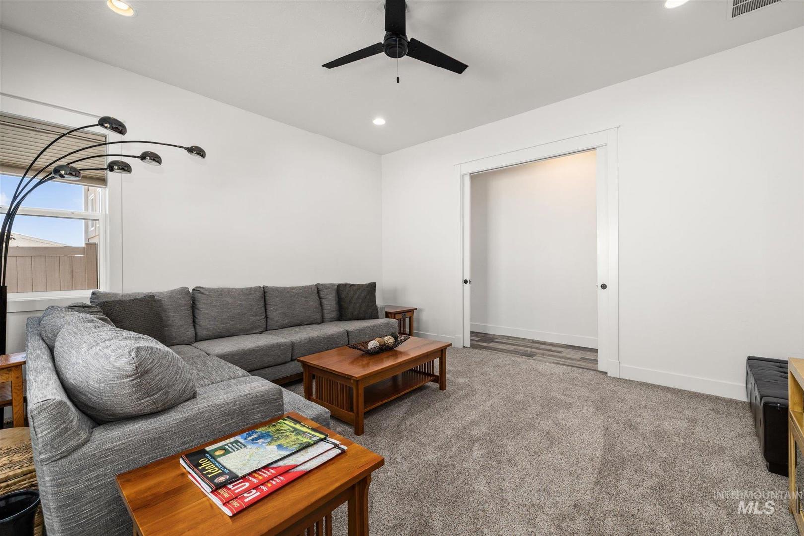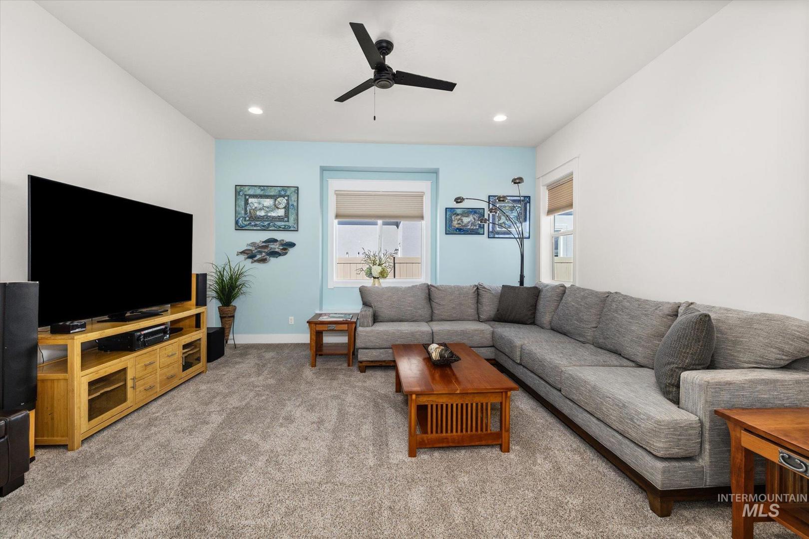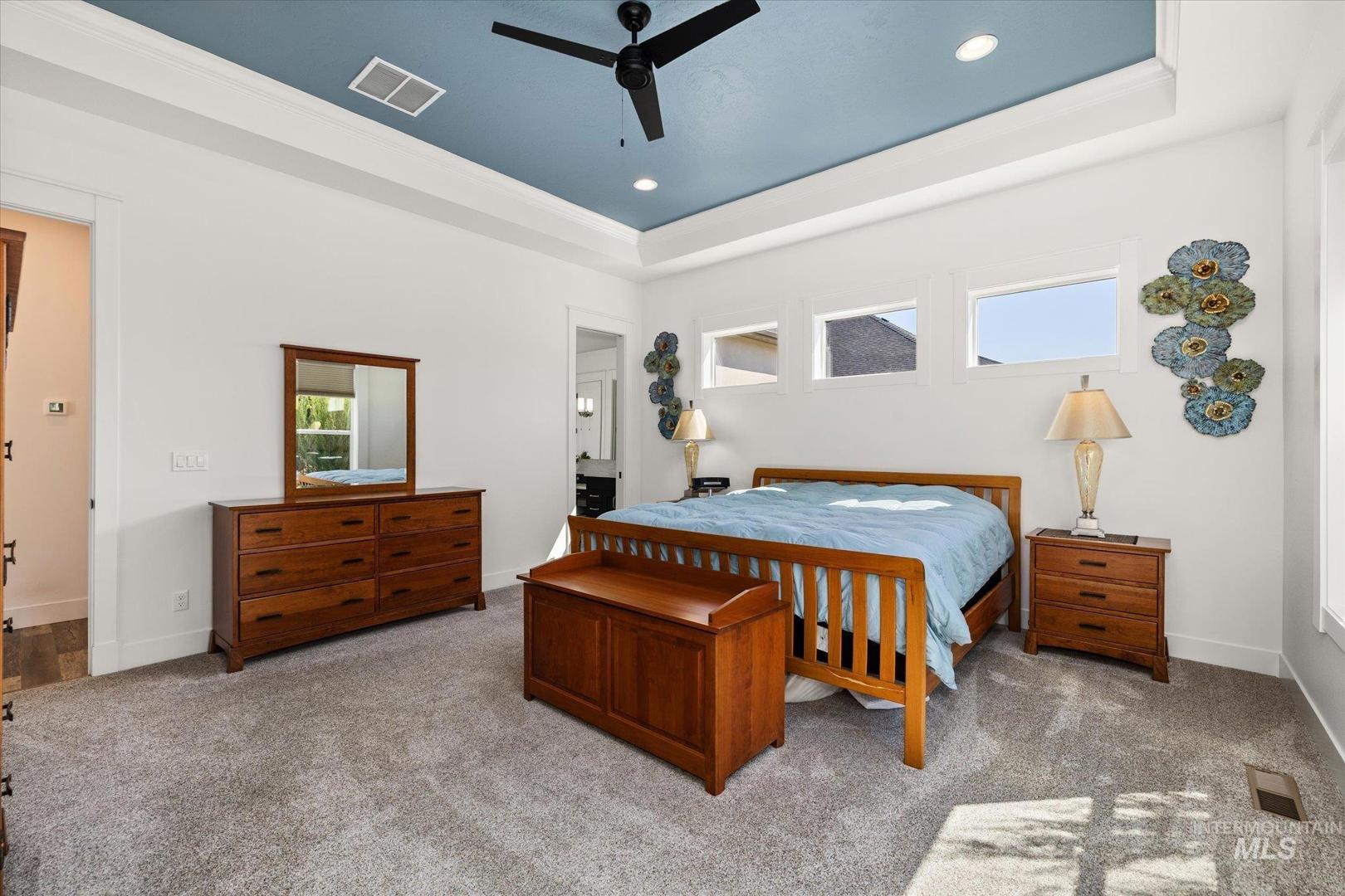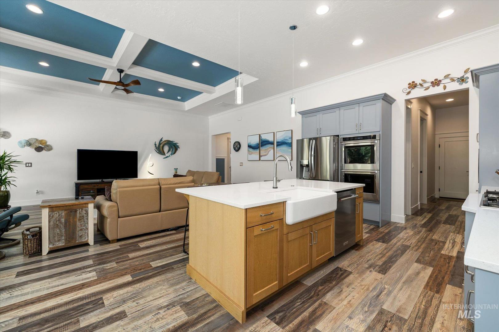 Immaculate luxury living in coveted Caven Ridge Estates with an exceptional RV bay! Striking great room with soaring ceilings, expansive windows, and a custom fireplace with remote control. Beautifully updated with fresh interior paint, updated flooring and new stainless steel double ovens, dishwasher, and refrigerator. Designed for both elegance and functionality, this single-level home features a spacious bonus room and a dedicated office. The gourmet kitchen impresses with quartz countertops, soft-close cabinetry, double ovens, and a generous walk-in pantry. The serene primary suite is filled with natural light and offers a spa-like bath with soaker tub, split dual vanities, and a tile walk-in shower. Enjoy effortless indoor-outdoor living on the covered patio with automatic shade—perfect for entertaining or relaxing. The oversized 3-car garage includes a rare RV bay (12’H x 12’W door 40’ deep bay) room for all of your toys. Ideally located on a quiet dead-end street just moments from the community pool, park, and playground.