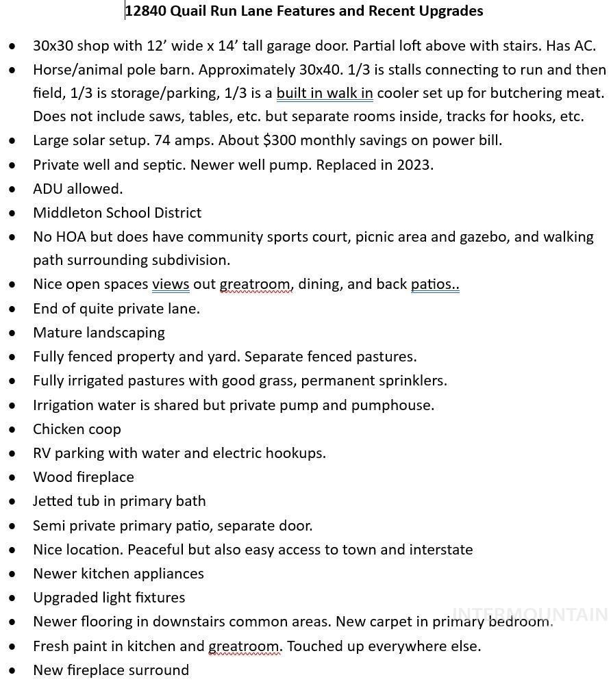Enjoy space, privacy and a property that supports a hands-on country lifestyle with this 2+ acre property and no HOA in the Middleton School District. The home offers 4 bedrooms, 3 bathrooms, bonus room and office/flex space. Well-suited for hobby farming or livestock, the property features a fully fenced and irrigated pasture, chicken coop, barn with animal stall, covered parking and walk-in cooler with meat hanger. A 30x30 insulated shop with loft provides space for equipment and projects. Tucked at the end of a quiet cul-de-sac off Emmett Rd & Purple Sage, enjoy privacy while maintaining easy access to town, plus the peacefulness of open spaces and an east-facing backyard. Additional features include RV parking, solar, ADU potential, plus a community sports court with picnic area and a 1-mile scenic walking loop. A well-equipped property with space and flexibility. See Features and Amenities list for more info!